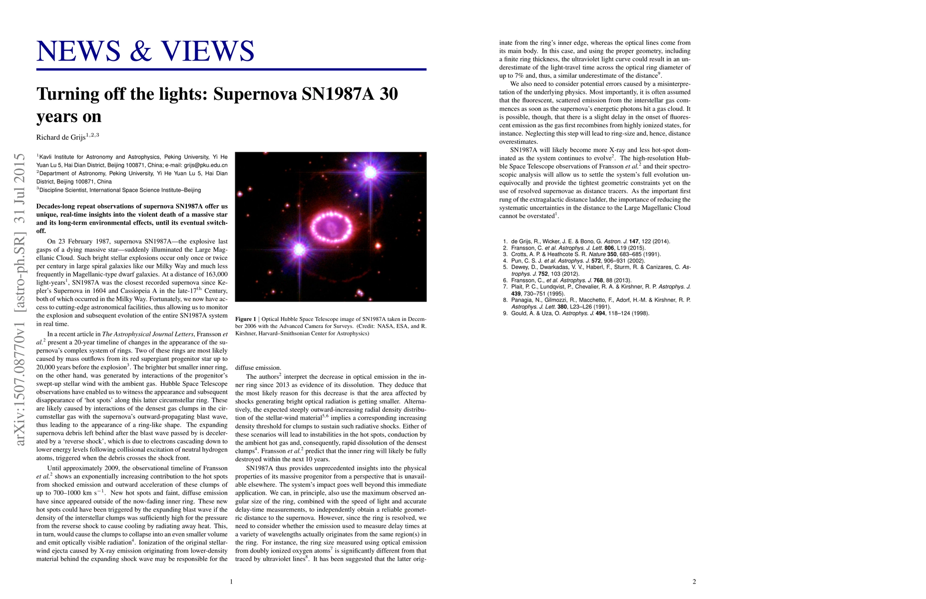 Decades-long repeat observations of supernova SN1987A offer us unique, real-time insights into the violent death of a massive star and its long-term environmental effects, until its eventual switch-off.