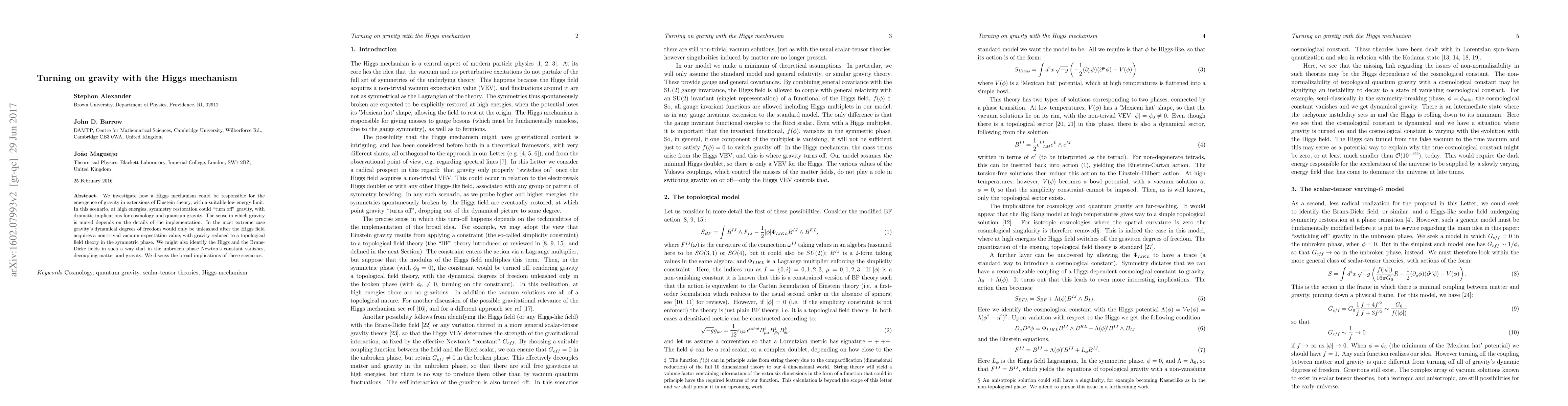 This paper explores how a Higgs mechanism could enable the emergence of gravity in extensions of Einstein's theory, suggesting that at high energies, gravity could be "turned off" through symmetry restoration, with significant implications for cosmology and quantum gravity. The decoupling of gravity from matter in the symmetric phase could lead to gravity being reduced to a topological field theory or even vanishing Newton's constant.