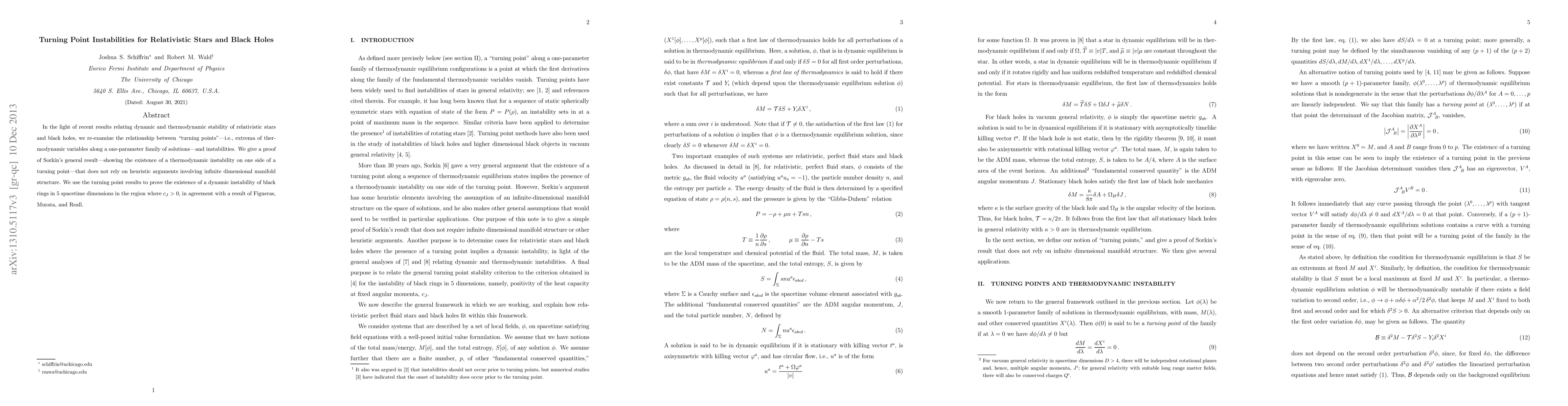 In the light of recent results relating dynamic and thermodynamic stability of relativistic stars and black holes, we re-examine the relationship between "turning points"---i.e., extrema of thermodynamic variables along a one-parameter family of solutions---and instabilities. We give a proof of Sorkin's general result---showing the existence of a thermodynamic instability on one side of a turning point---that does not rely on heuristic arguments involving infinite dimensional manifold structure. We use the turning point results to prove the existence of a dynamic instability of black rings in 5 spacetime dimensions in the region where $c_J > 0$, in agreement with a result of Figueras, Murata, and Reall.