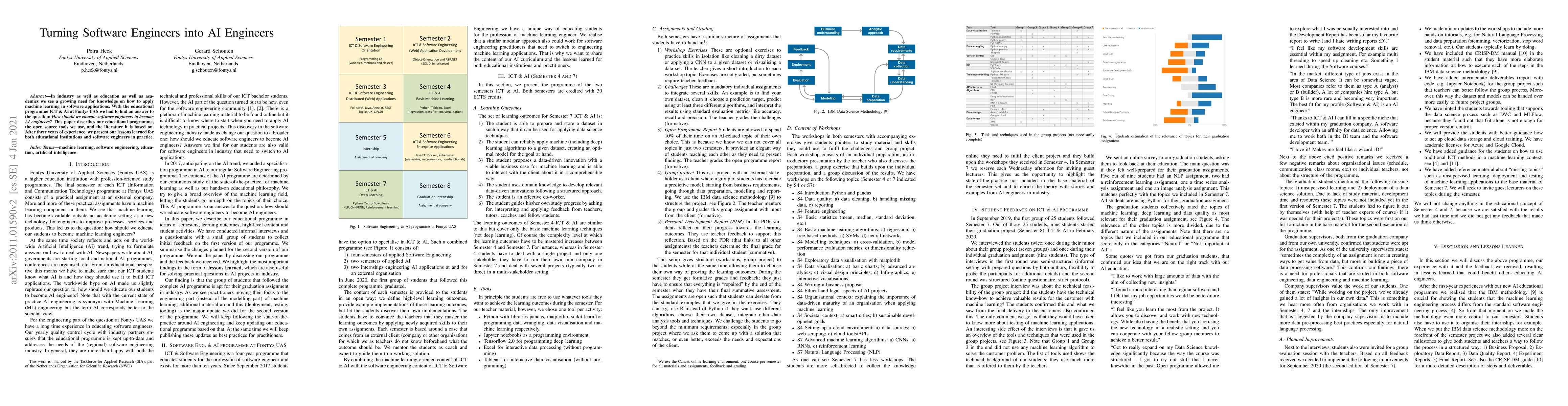 In industry as well as education as well as academics we see a growing need for knowledge on how to apply machine learning in software applications. With the educational programme ICT & AI at Fontys UAS we had to find an answer to the question: "How should we educate software engineers to become AI engineers?" This paper describes our educational programme, the open source tools we use, and the literature it is based on. After three years of experience, we present our lessons learned for both educational institutions and software engineers in practice.