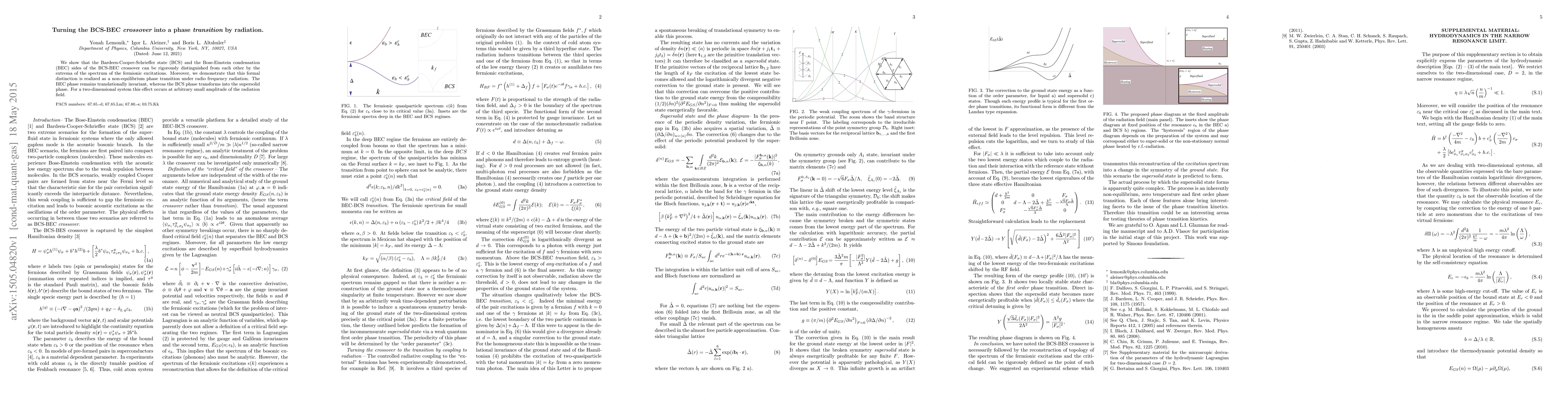 We show that the Bardeen-Cooper-Schrieffer state (BCS) and the Bose-Einstein condensation (BEC) sides of the BCS-BEC crossover can be rigorously distinguished from each other by the extrema of the spectrum of the fermionic excitations. Moreover, we demonstrate that this formal distinction is realized as a non-equilibrium phase transition under radio frequency radiation. The BEC phase remains translationally invariant, whereas the BCS phase transforms into the supersolid phase. For a two-dimensional system this effect occurs at arbitrary small amplitude of the radiation field.