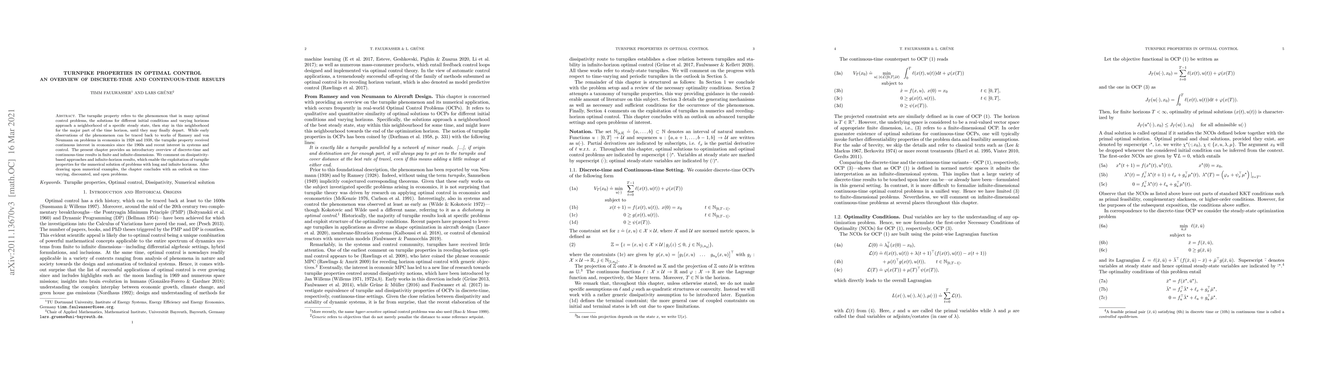 The turnpike property refers to the phenomenon that in many optimal control problems, the solutions for different initial conditions and varying horizons approach a neighborhood of a specific steady state, then stay in this neighborhood for the major part of the time horizon, until they may finally depart. While early observations of the phenomenon can be traced back to works of Ramsey and von Neumann on problems in economics in 1928 and 1938, the turnpike property received continuous interest in economics since the 1960s and recent interest in systems and control. The present chapter provides an introductory overview of discrete-time and continuous-time results in finite and infinite-dimensions. We comment on dissipativity-based approaches and infinite-horizon results, which enable the exploitation of turnpike properties for the numerical solution of problems with long and infinite horizons. After drawing upon numerical examples, the chapter concludes with an outlook on time-varying, discounted, and open problems.