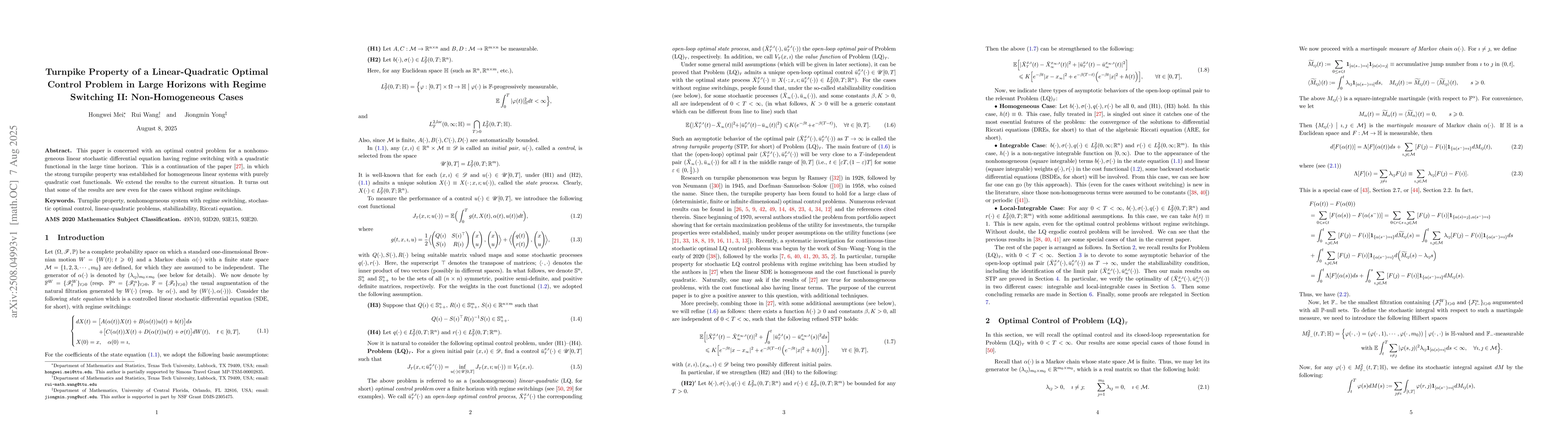 This paper is concerned with an optimal control problem for a nonhomogeneous linear stochastic differential equation having regime switching with a quadratic functional in the large time horizon. This is a continuation of the paper \cite{Mei-Wang-Yong-2025}, in which the strong turnpike property was established for homogeneous linear systems with purely quadratic cost functionals. We extend the results to the current situation. It turns out that some of the results are new even for the cases without regime switchings.