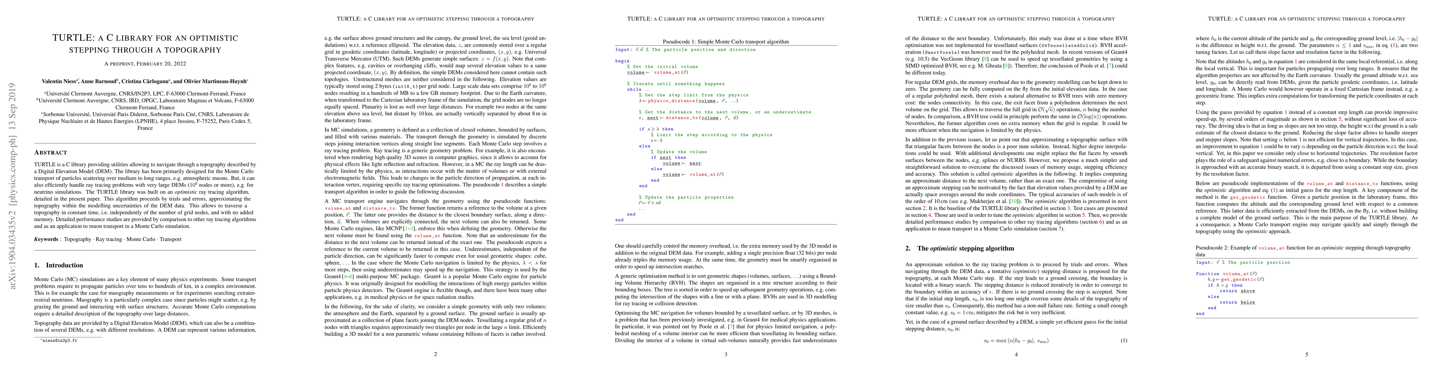 TURTLE is a C library providing utilities allowing to navigate through a topography described by a Digital Elevation Model (DEM). The library has been primarily designed for the Monte Carlo transport of particles scattering over medium to long ranges, e.g. atmospheric muons. But, it can also efficiently handle ray tracing problems with very large DEMs ($10^9$ nodes or more), e.g. for neutrino simulations. The TURTLE library was built on an optimistic ray tracing algorithm, detailed in the present paper. This algorithm proceeds by trials and errors, approximating the topography within the modelling uncertainties of the DEM data. This allows to traverse a topography in constant time, i.e. independently of the number of grid nodes, and with no added memory. Detailed performance studies are provided by comparison to other ray tracing algorithms and as an application to muon transport in a Monte Carlo simulation.