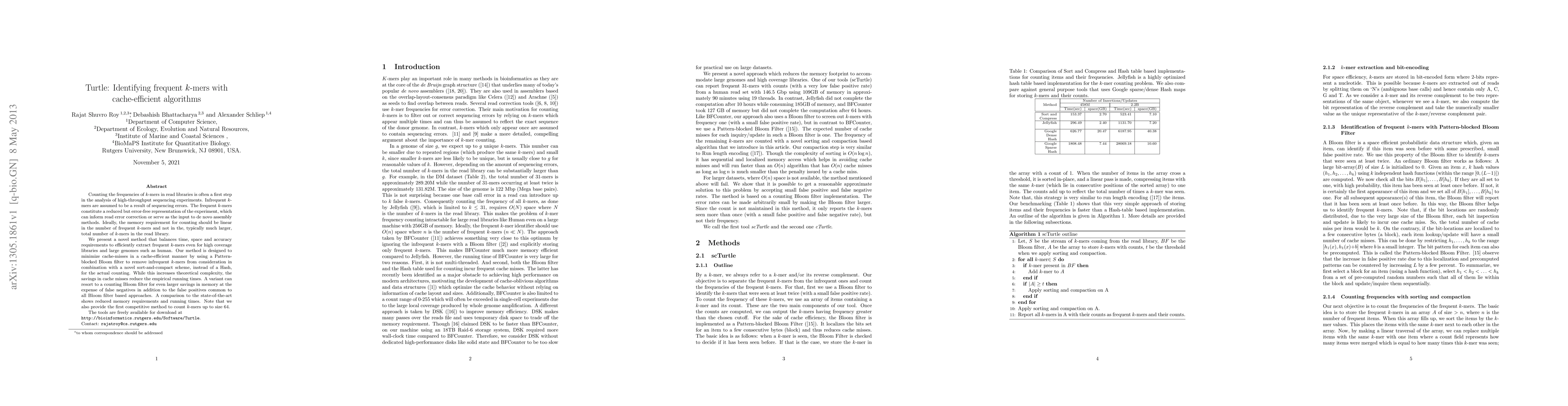 This paper introduces a novel cache-efficient algorithm for identifying frequent k-mers in high-throughput sequencing data, using a Pattern-blocked Bloom filter and a sort-and-compact scheme to minimize cache misses and reduce memory requirements. The method achieves faster running times and lower memory usage compared to state-of-the-art alternatives.