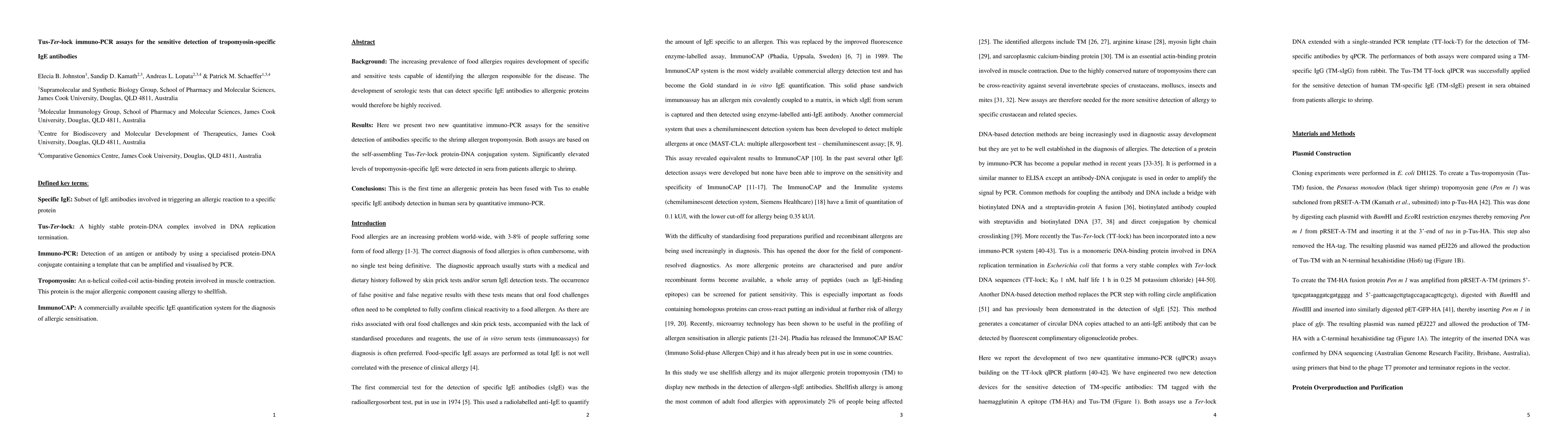 This paper introduces two Tus-Ter-lock immuno-PCR assays for detecting shrimp allergen tropomyosin-specific IgE antibodies, showing elevated levels in allergic patients, marking a novel approach for allergen-specific IgE detection.