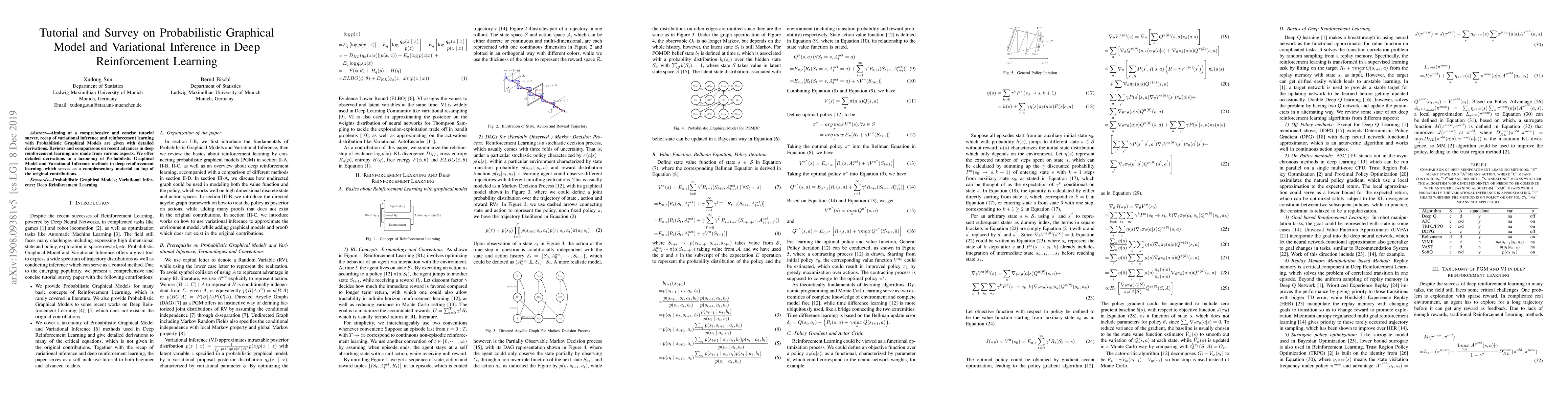 Aiming at a comprehensive and concise tutorial survey, recap of variational inference and reinforcement learning with Probabilistic Graphical Models are given with detailed derivations. Reviews and comparisons on recent advances in deep reinforcement learning are made from various aspects. We offer detailed derivations to a taxonomy of Probabilistic Graphical Model and Variational Inference methods in deep reinforcement learning, which serves as a complementary material on top of the original contributions.