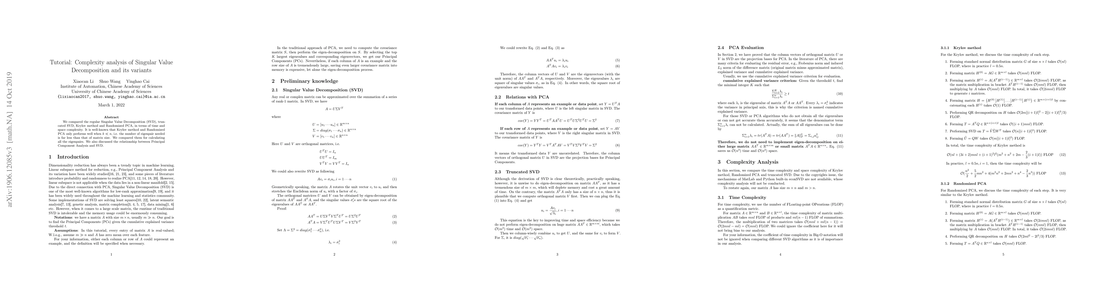 This paper compares the time and space complexity of Singular Value Decomposition (SVD), truncated SVD, Krylov method, and Randomized PCA, highlighting that Krylov and Randomized PCA are most efficient when the number of required eigenpairs is much smaller than the matrix size. It also explores the relationship between PCA and SVD.
