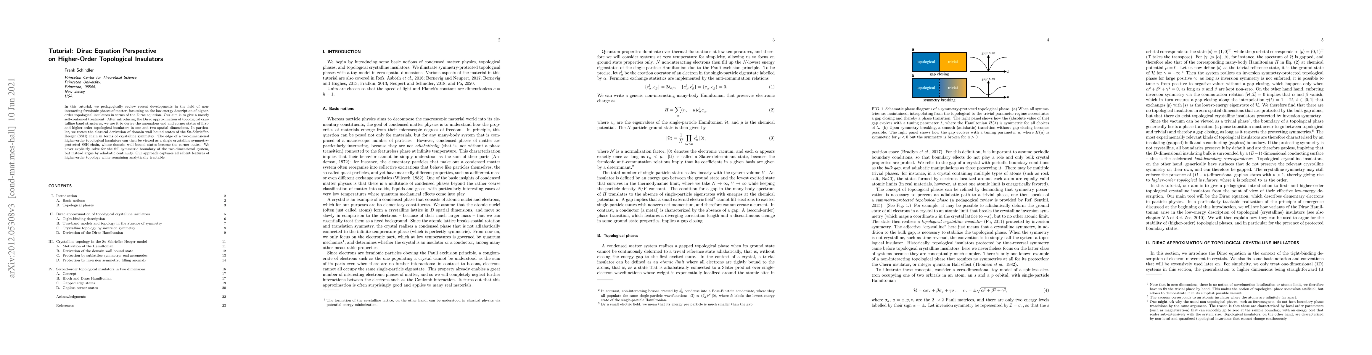 In this tutorial, we pedagogically review recent developments in the field of non-interacting fermionic phases of matter, focussing on the low energy description of higher-order topological insulators in terms of the Dirac equation. Our aim is to give a mostly self-contained treatment. After introducing the Dirac approximation of topological crystalline band structures, we use it to derive the anomalous end and corner states of first- and higher-order topological insulators in one and two spatial dimensions. In particular, we recast the classical derivation of domain wall bound states of the Su-Schrieffer-Heeger (SSH) chain in terms of crystalline symmetry. The edge of a two-dimensional higher-order topological insulators can then be viewed as a single crystalline symmetry-protected SSH chain, whose domain wall bound states become the corner states. We never explicitly solve for the full symmetric boundary of the two-dimensional system, but instead argue by adiabatic continuity. Our approach captures all salient features of higher-order topology while remaining analytically tractable.