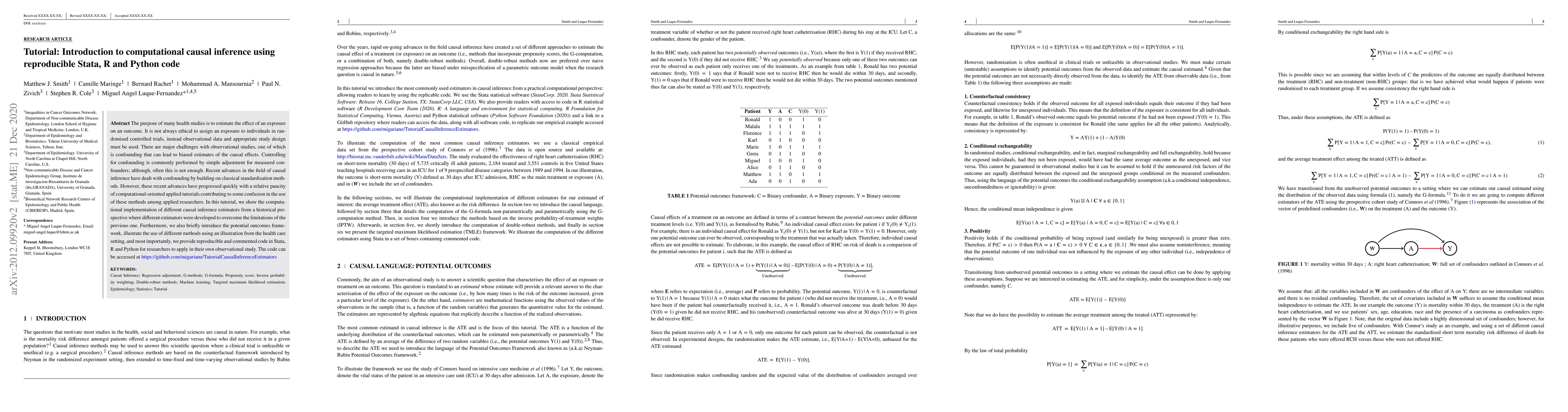 This tutorial introduces computational causal inference methods for estimating exposure effects in observational studies, addressing confounding issues. It provides reproducible code in Stata, R, and Python, illustrating the historical development of causal inference estimators and their application in healthcare research.