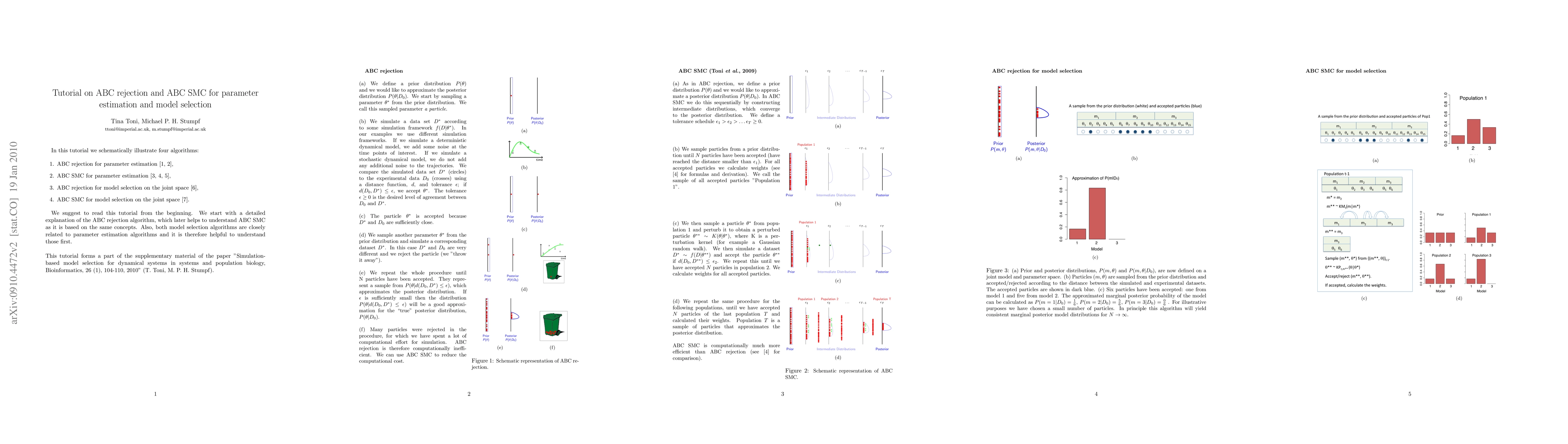 In this tutorial we schematically illustrate four algorithms: (1) ABC rejection for parameter estimation (2) ABC SMC for parameter estimation (3) ABC rejection for model selection on the joint space (4) ABC SMC for model selection on the joint space.