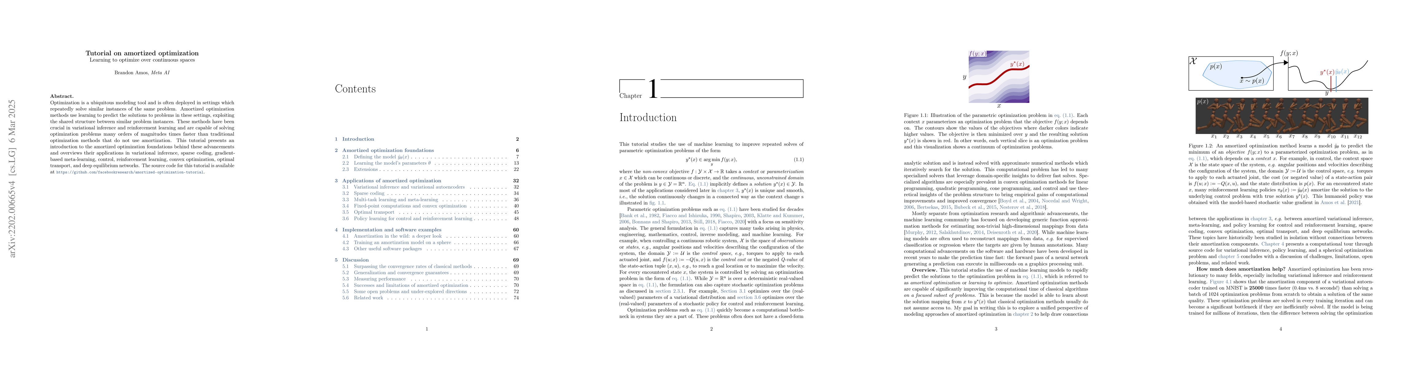This tutorial introduces amortized optimization, which leverages learning to predict solutions for repeated problem instances, significantly speeding up optimization compared to traditional methods. It covers applications in various fields including variational inference, reinforcement learning, and deep learning, and provides source code for implementation.