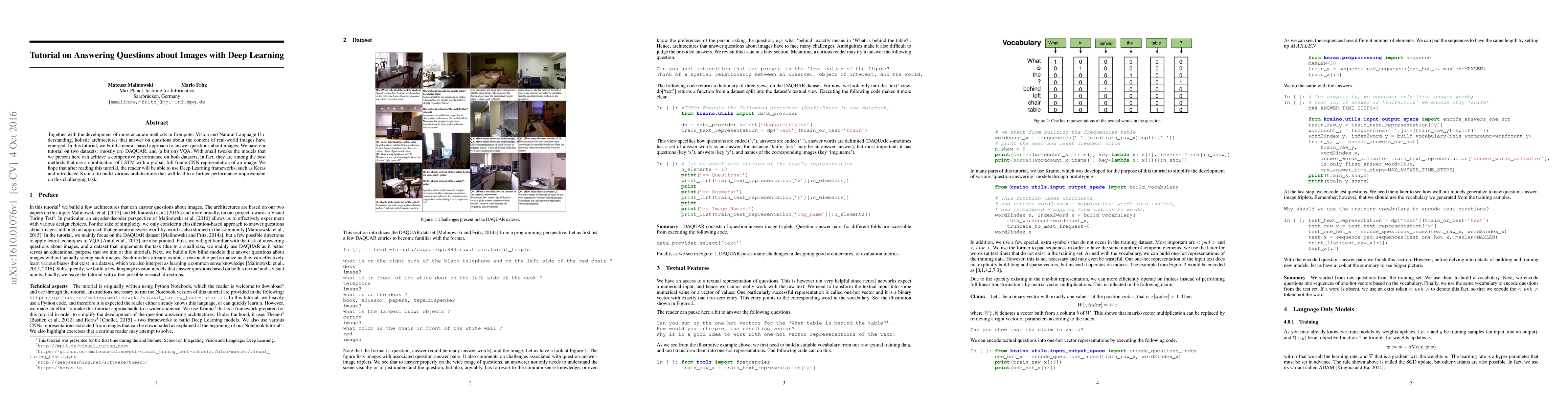 This tutorial demonstrates a neural-based approach using LSTM and CNN to answer questions about images, achieving competitive results on DAQUAR and VQA datasets. It aims to equip readers with the skills to build and improve models using Deep Learning frameworks like Keras.