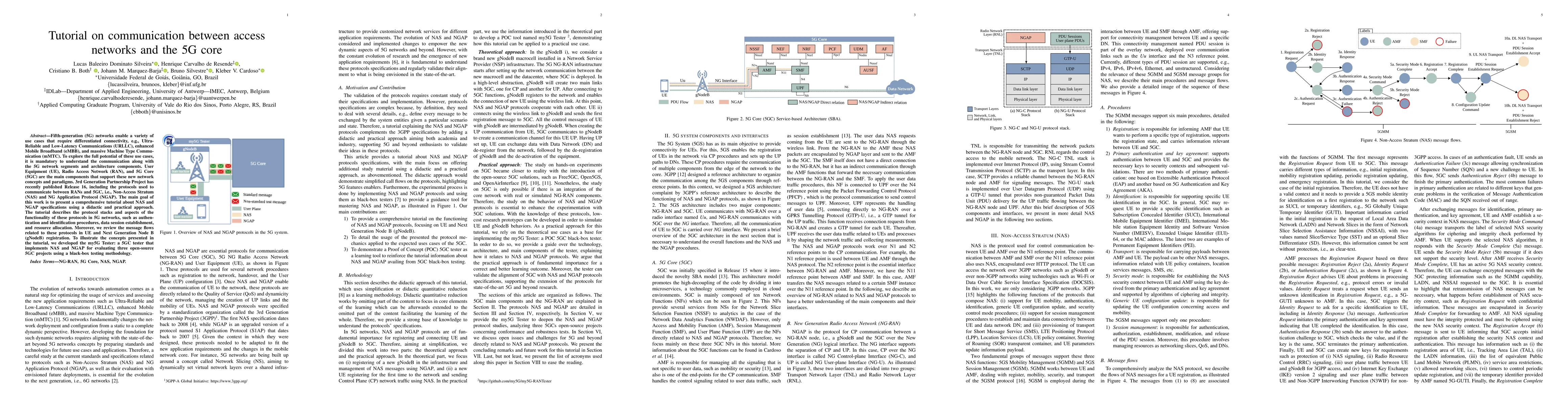 This paper provides a comprehensive tutorial on the communication protocols between access networks and the 5G core, focusing on Non-Access Stratum (NAS) and NG Application Protocol (NGAP). It details protocol stacks, functionalities, and message flows, and introduces a tester tool for evaluating 5G core implementations.