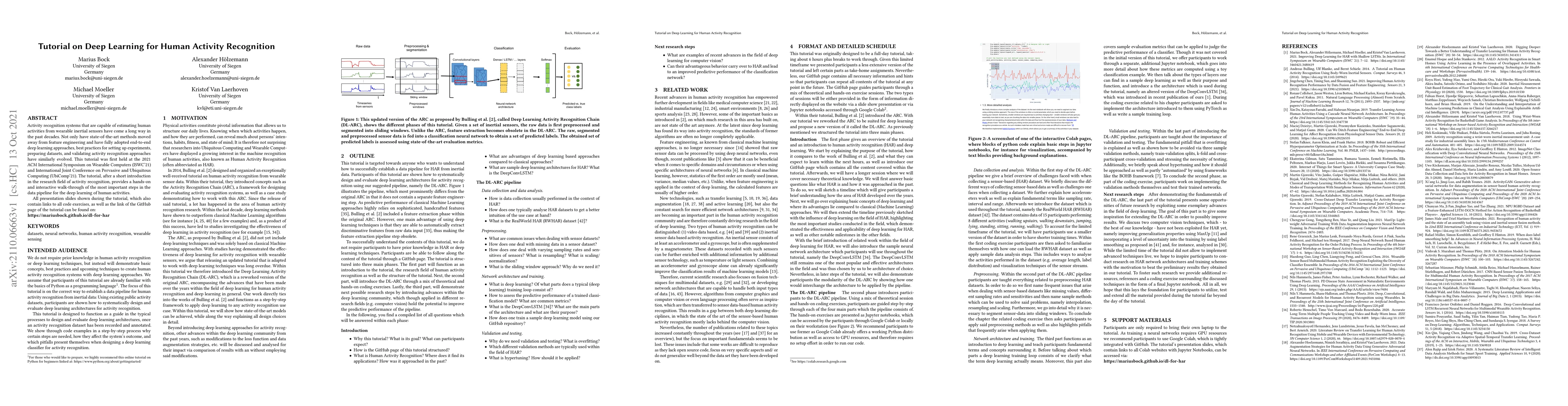 This tutorial offers a comprehensive guide on deep learning for human activity recognition using wearable inertial sensors, emphasizing end-to-end deep learning methods and best practices for dataset preparation and experiment validation. It includes hands-on exercises and is available with slides and code on its GitHub page.