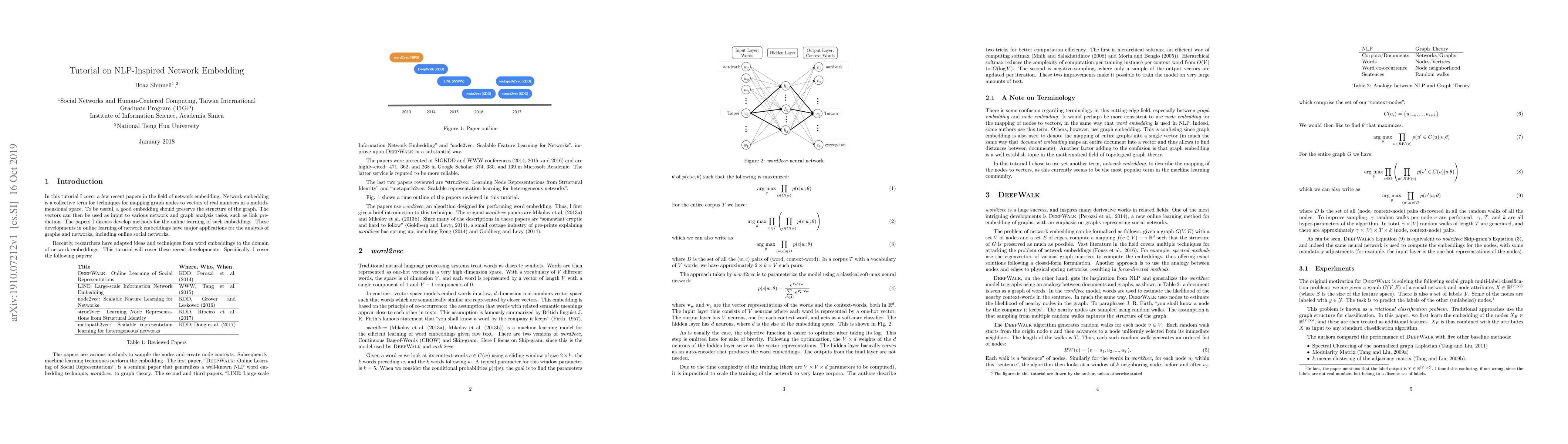 This tutorial reviews recent advancements in network embedding techniques, focusing on methods like DeepWalk, LINE, node2vec, struc2vec, and megapath2vec for mapping graph nodes to vector representations that preserve graph structure, enabling applications in network analysis and link prediction.