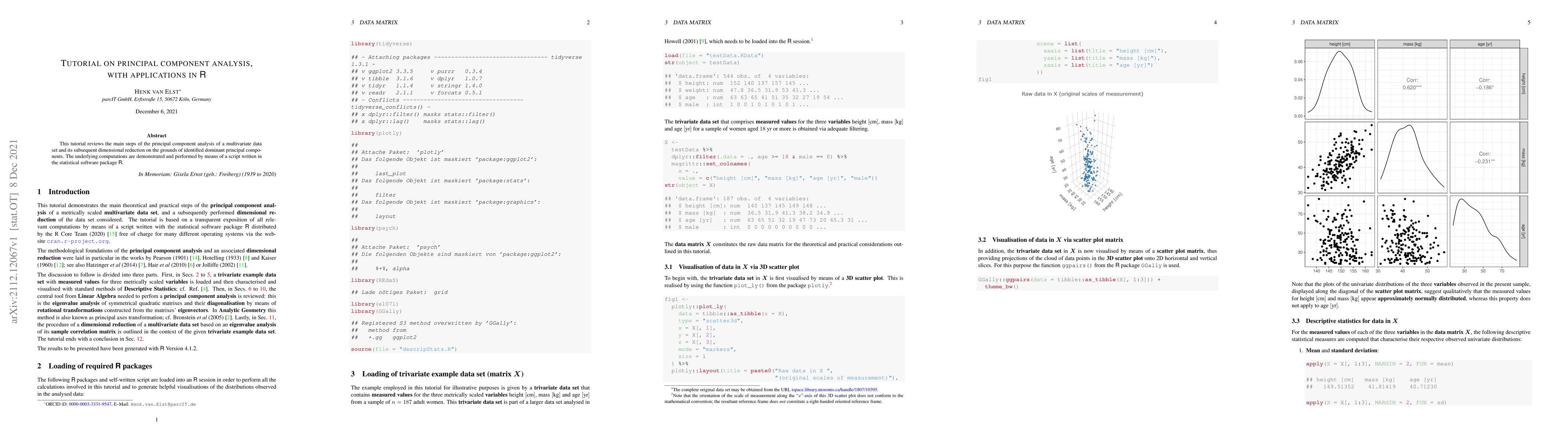 This tutorial provides a comprehensive overview of principal component analysis (PCA) for multivariate data, focusing on its application for dimensionality reduction and utilizing R for computational demonstrations. Practical examples and R code are provided to facilitate understanding.