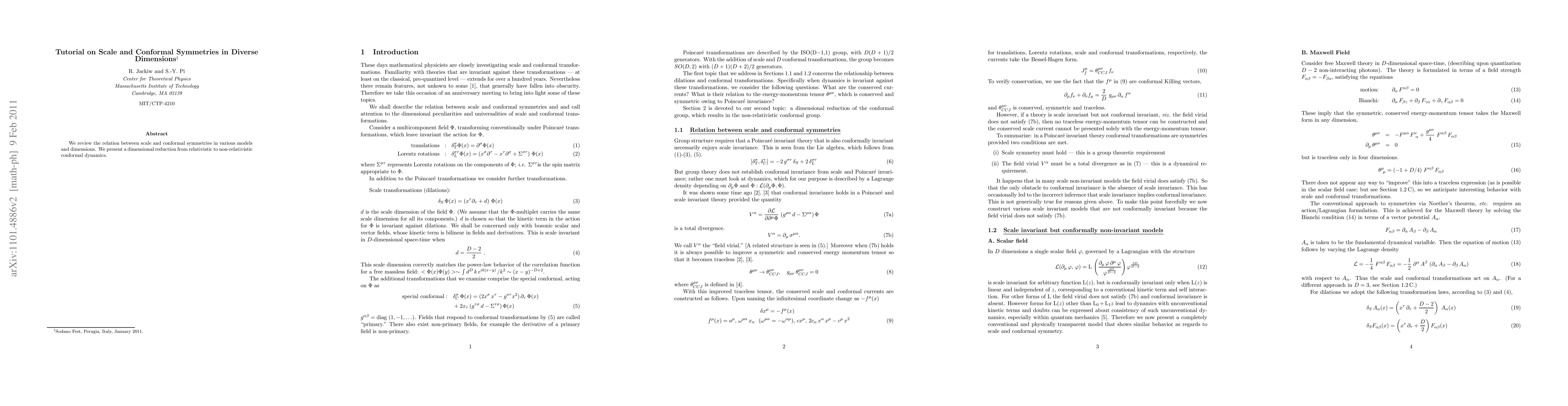 The paper presents a tutorial on scale and conformal symmetries in diverse dimensions, reviewing their relation in various models and demonstrating dimensional reduction from relativistic to non-relativistic conformal dynamics.