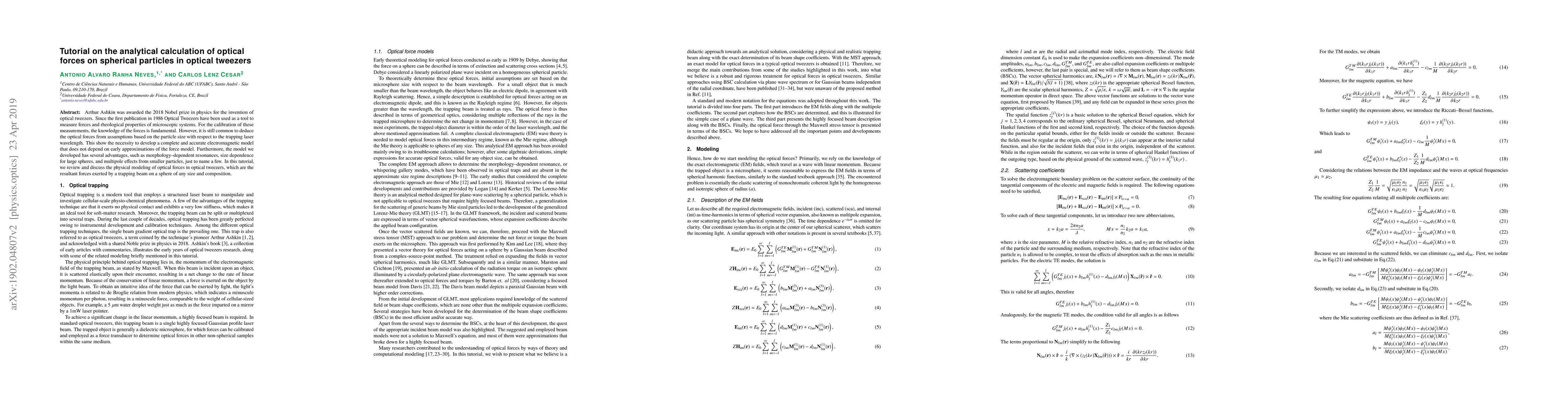 This paper provides a detailed tutorial on the analytical calculation of optical forces on spherical particles in optical tweezers, emphasizing the development of a comprehensive electromagnetic model that accurately accounts for various particle characteristics, moving beyond traditional assumptions. The new model addresses morphology-dependent resonances, size dependence, and multipole effects.