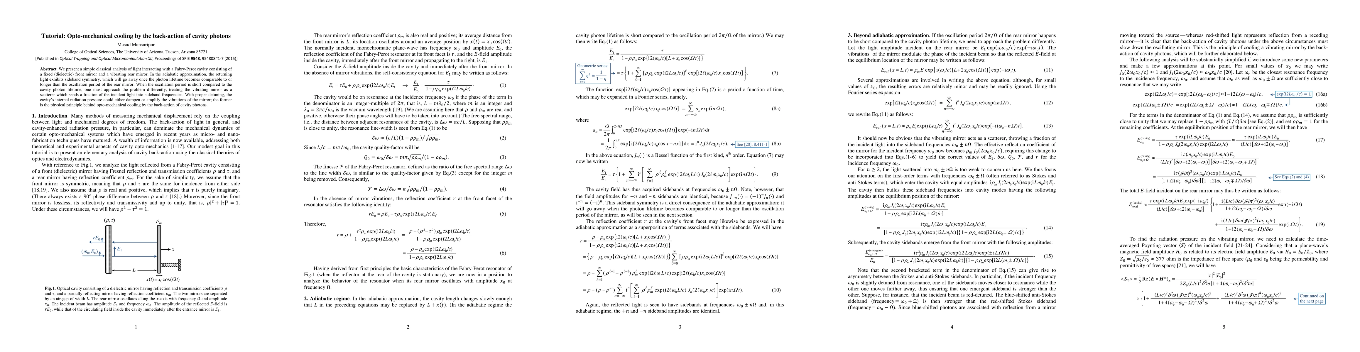 This paper provides a classical analysis of opto-mechanical cooling via the interaction of light with a Fabry-Perot cavity, where a vibrating mirror scatters light into sideband frequencies. The internal radiation pressure can dampen mirror vibrations, achieving cooling through the back-action of cavity photons.