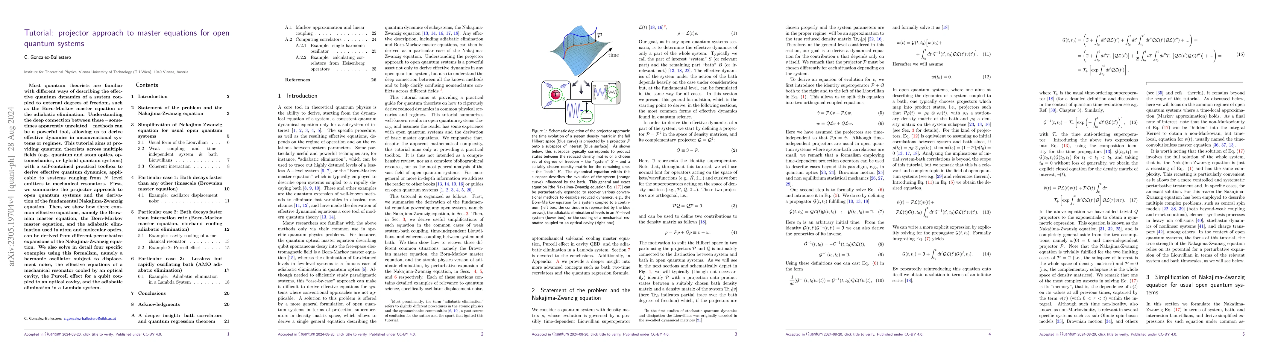 This paper provides a comprehensive tutorial on the projector approach to open quantum systems, summarizing the Nakajima-Zwanzig equation and its derivation. It demonstrates how three common effective equations can be derived from different perturbative expansions, and applies this methodology to specific examples like a Lambda system and a mechanical resonator cooled by an optical cavity.