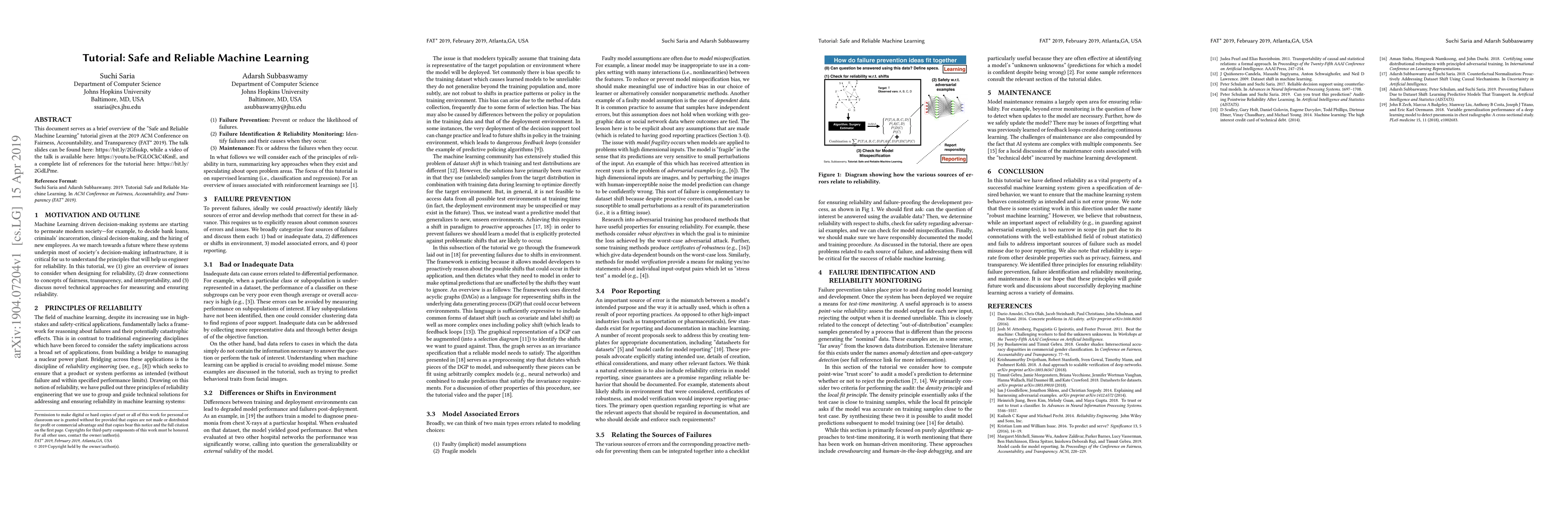 This document provides an overview of a tutorial on "Safe and Reliable Machine Learning" presented at the 2019 ACM FAT* conference, focusing on ensuring the ethical and dependable deployment of machine learning systems. Additional resources include slides, video, and a comprehensive reference list.