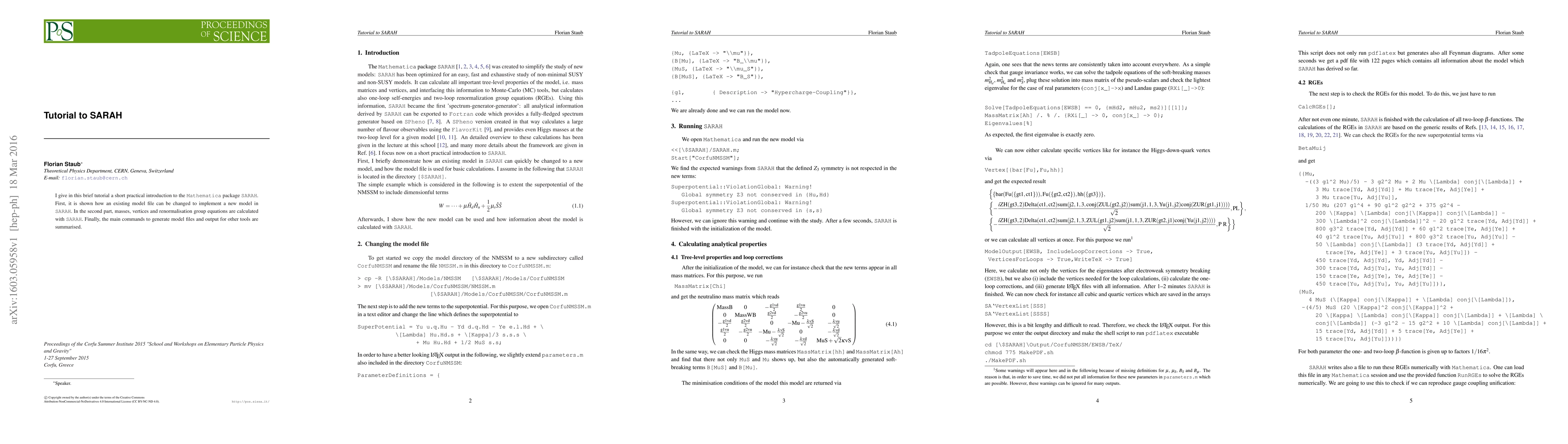I give in this brief tutorial a short practical introduction to the Mathematica package SARAH. First, it is shown how an existing model file can be changed to implement a new model in SARAH. In the second part, masses, vertices and renormalisation group equations are calculated with SARAH. Finally, the main commands to generate model files and output for other tools are summarised.