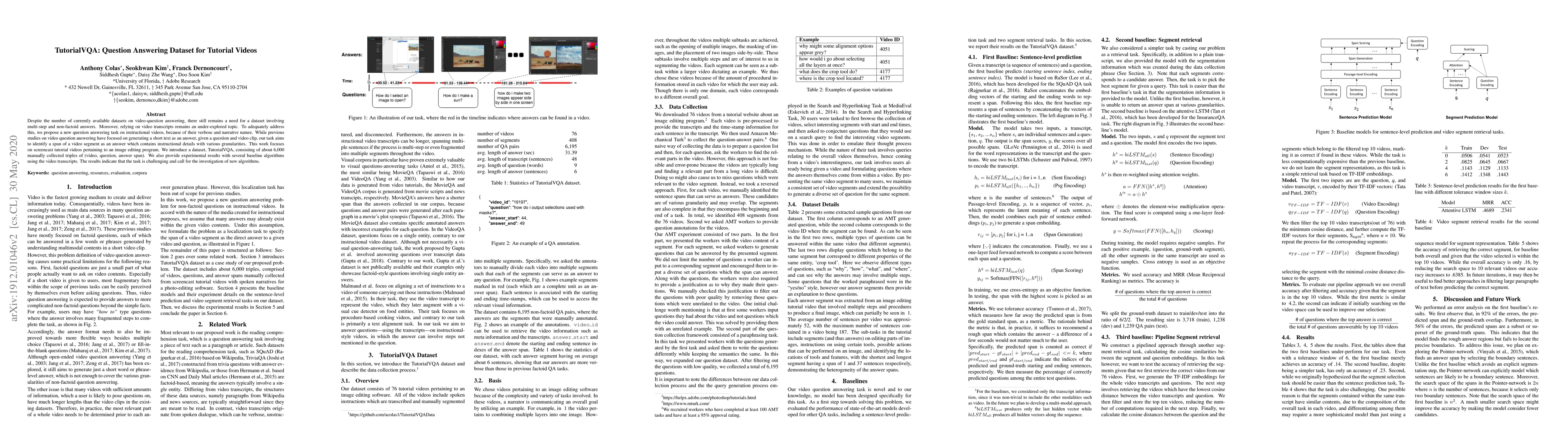The paper introduces TutorialVQA, a new dataset for question answering in instructional video tutorials, focusing on identifying video segments that contain detailed instructional content. This dataset aims to address the need for multi-step and non-factoid answers, and experimental results show the task's complexity, highlighting the need for advanced algorithms.