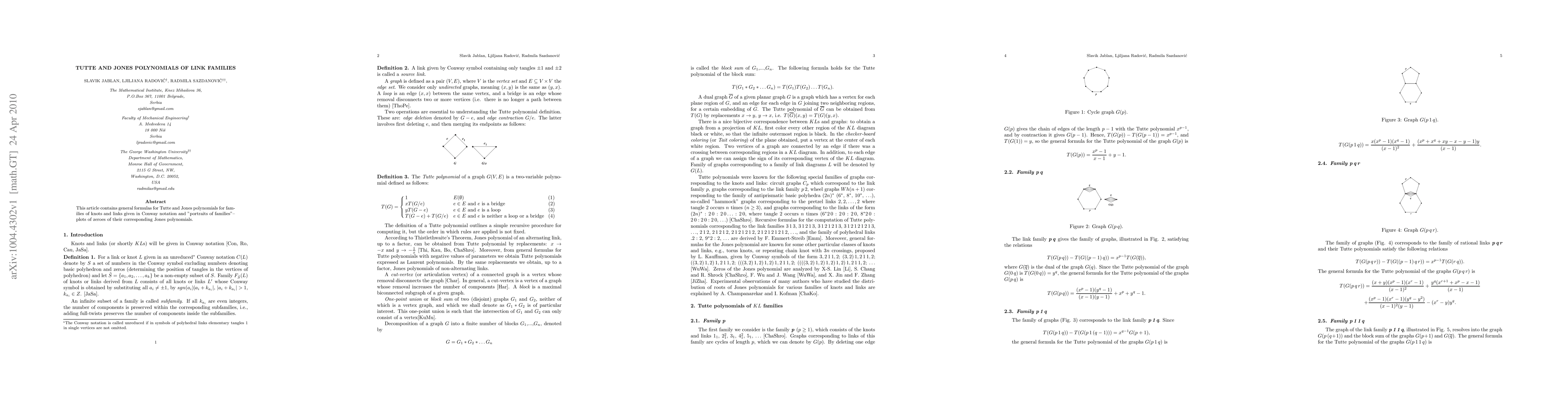 Summary: This paper presents comprehensive formulas for Tutte and Jones polynomials for specific knot and link families, utilizing Conway notation and visual "portraits" to illustrate zeroes of their Jones polynomials.