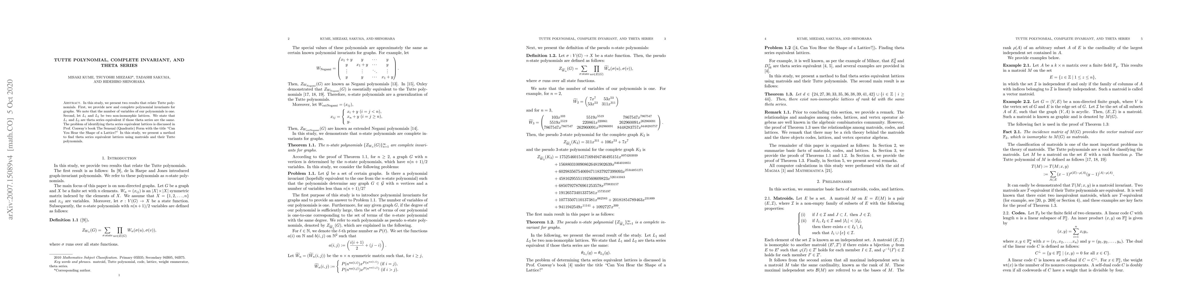 In this study, we present two results that relate Tutte polynomials. First, we provide new and complete polynomial invariants for graphs. We note that the number of variables of our polynomials is one. Second, let L_1 and L_2 be two non-isomorphic lattices. We state that L_1 and L_2 are theta series equivalent if those theta series are the same. The problem of identifying theta series equivalent lattices is discussed in Prof.~Conway's book The Sensual (Quadratic) Form with the title "Can You Hear the Shape of a Lattice?" In this study, we present a method to find theta series equivalent lattices using matroids and their Tutte polynomials.