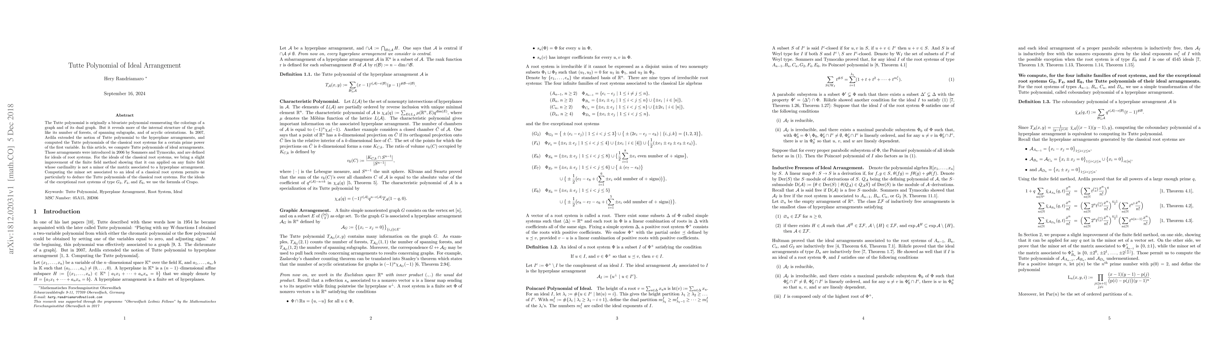 This paper extends the Tutte polynomial concept to ideal arrangements introduced by Sommers and Tymoczko in 2006. The authors improve the finite field method for calculating Tutte polynomials of classical root systems and apply Crapo's formula for exceptional root systems.