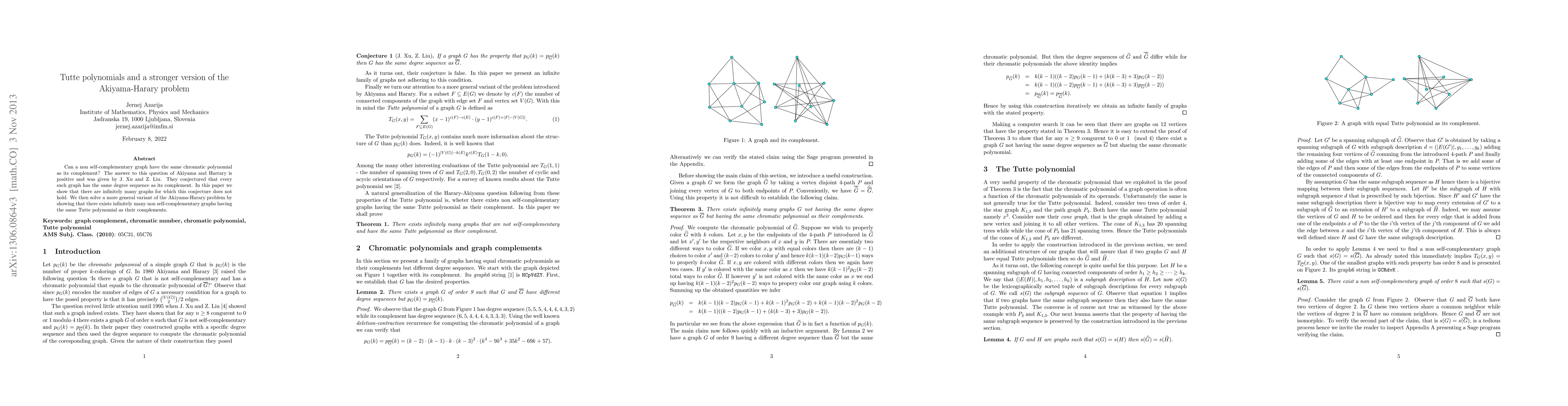 Can a non self-complementary graph have the same chromatic polynomial as its complement? The answer to this question of Akiyama and Harrary is positive and was given by J. Xu and Z. Liu. They conjectured that every such graph has the same degree sequence as its complement. In this paper we show that there are infinitely many graphs for which this conjecture does not hold. We then solve a more general variant of the Akiyama-Harary problem by showing that there exists infinitely many non self-complementary graphs having the same Tutte polynomial as their complements.