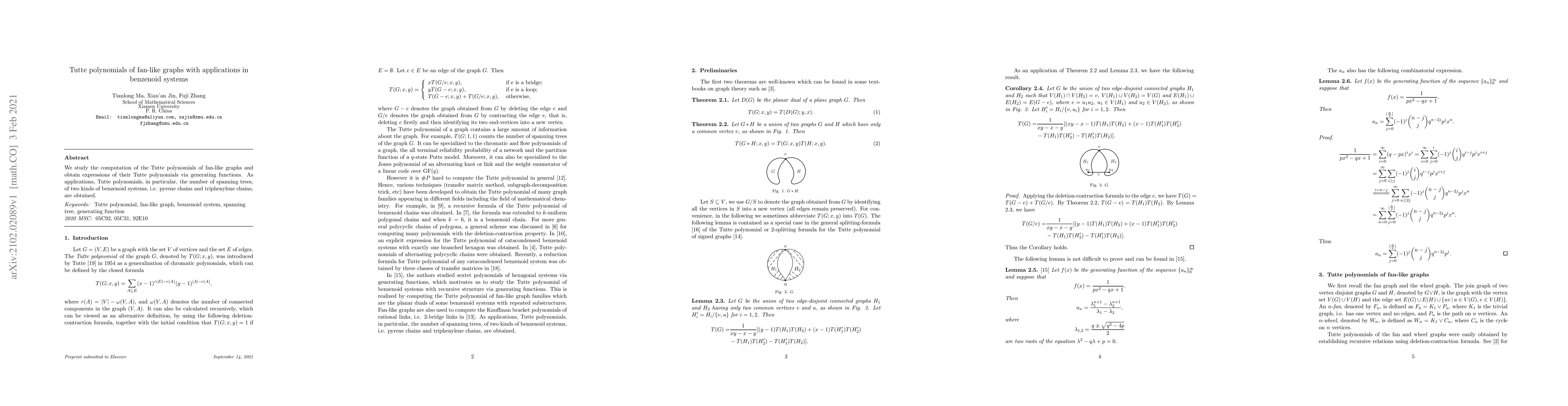 We study the computation of the Tutte polynomials of fan-like graphs and obtain expressions of their Tutte polynomials via generating functions. As applications, Tutte polynomials, in particular, the number of spanning trees, of two kinds of benzenoid systems, i.e. pyrene chains and triphenylene chains, are obtained.