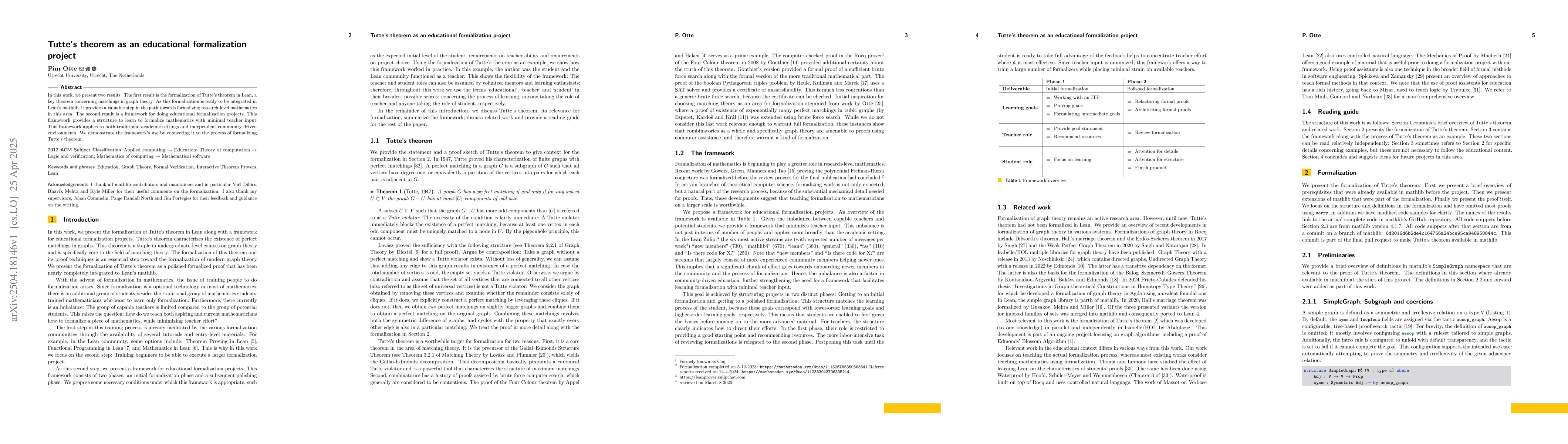The research formalizes Tutte's theorem in Lean, a theorem concerning matchings in graph theory, and proposes a framework for educational formalization projects applicable in both academic and community-driven settings.