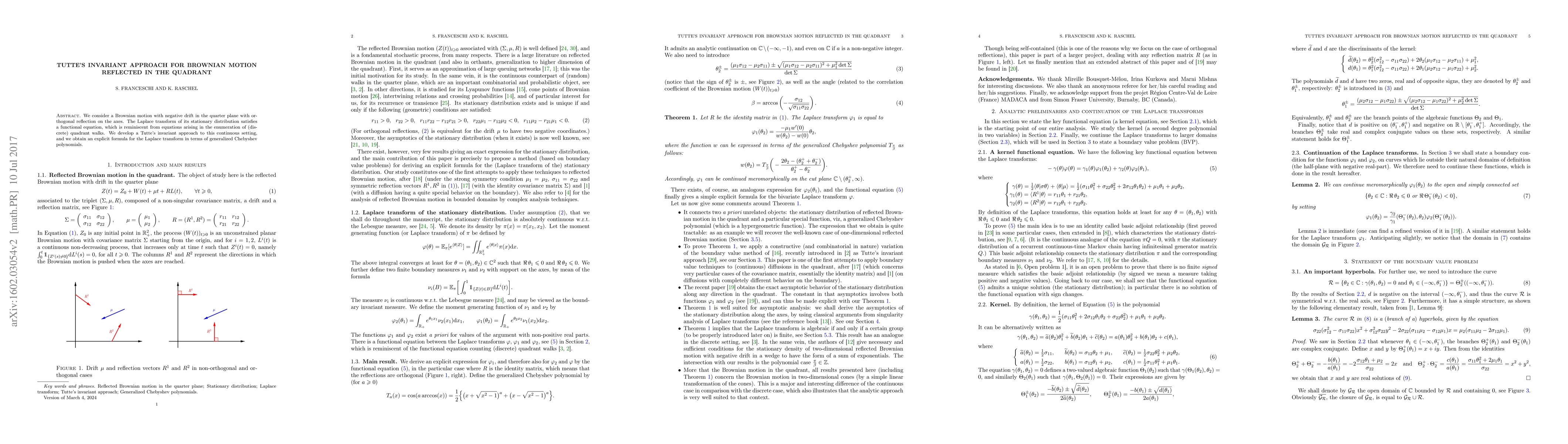 This paper uses Tutte's invariant approach to analyze a Brownian motion with drift reflected in the quadrant, deriving a functional equation for its stationary distribution's Laplace transform. An explicit formula for the Laplace transform is obtained using generalized Chebyshev polynomials.