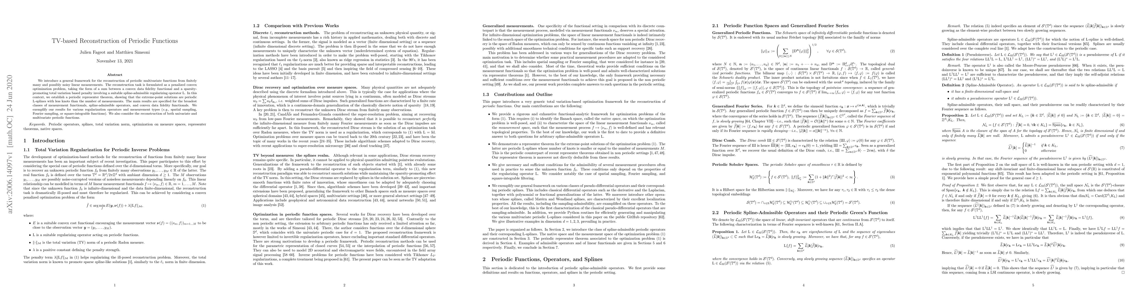 We introduce a general framework for the reconstruction of periodic multivariate functions from finitely many and possibly noisy linear measurements. The reconstruction task is formulated as a penalized convex optimization problem, taking the form of a sum between a convex data fidelity functional and a sparsity-promoting total variation based penalty involving a suitable spline-admissible regularizing operator L. In this context, we establish a periodic representer theorem, showing that the extreme-point solutions are periodic L-splines with less knots than the number of measurements. The main results are specified for the broadest classes of measurement functionals, spline-admissible operators, and convex data fidelity functionals. We exemplify our results for various regularization operators and measurement types (e.g., spatial sampling, Fourier sampling, or square-integrable functions). We also consider the reconstruction of both univariate and multivariate periodic functions.