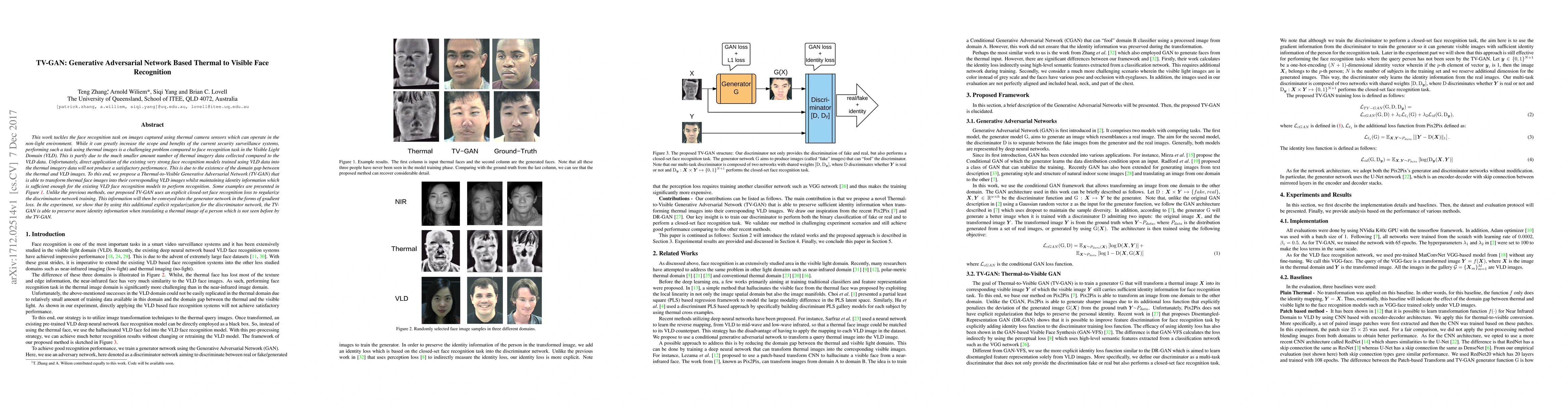 This paper proposes a Thermal-to-Visible Generative Adversarial Network (TV-GAN) to bridge the domain gap between thermal and visible light domain face images, enabling effective face recognition in low-light conditions. The TV-GAN employs an explicit closed-set face recognition loss to enhance the discriminator network, thereby preserving identity information during translation.