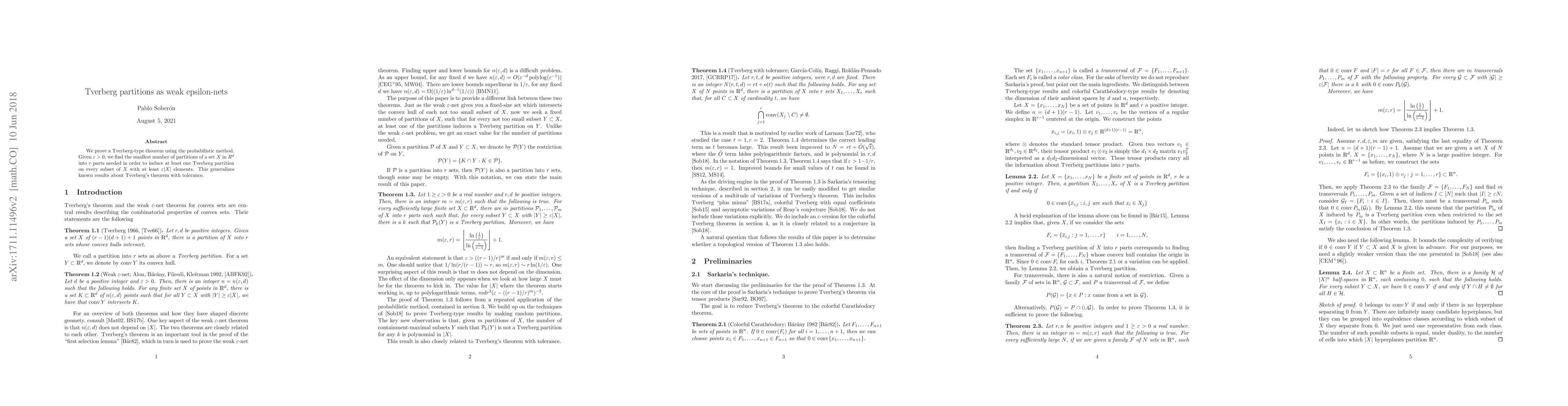 This paper proves a Tverberg-type theorem using probabilistic methods, determining the minimum number of partitions of a set in $R^d$ required to ensure at least one Tverberg partition on any sufficiently large subset, generalizing results on Tverberg's theorem with tolerance.