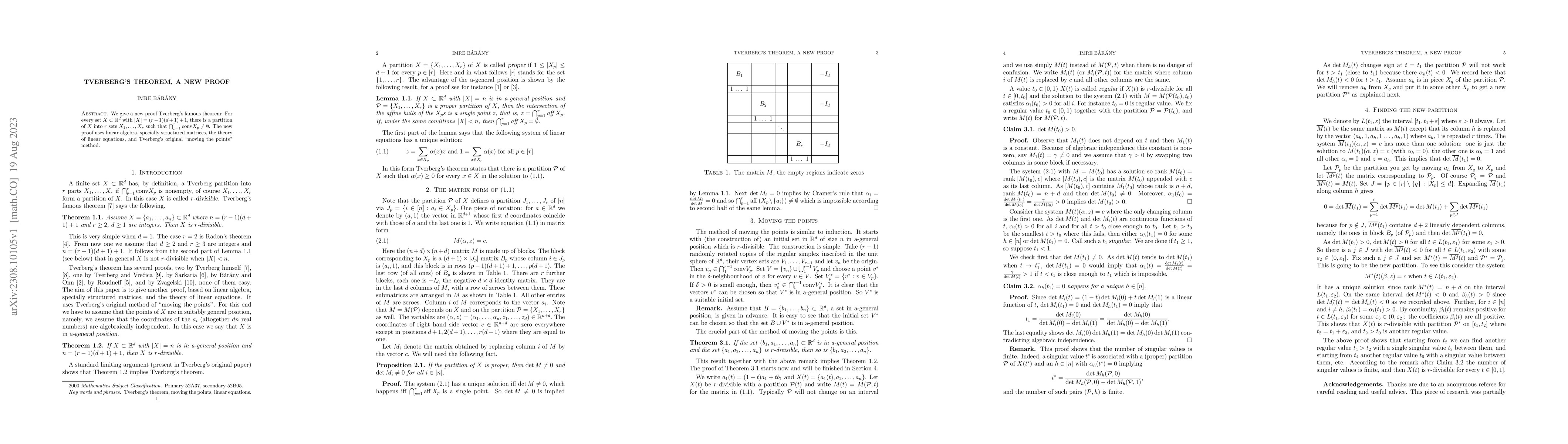 This paper presents a novel proof of Tverberg's theorem, utilizing linear algebra, structured matrices, and the theory of linear equations, alongside Tverberg's original "moving the points" technique to demonstrate the partition of a set into subsets whose convex hulls intersect.