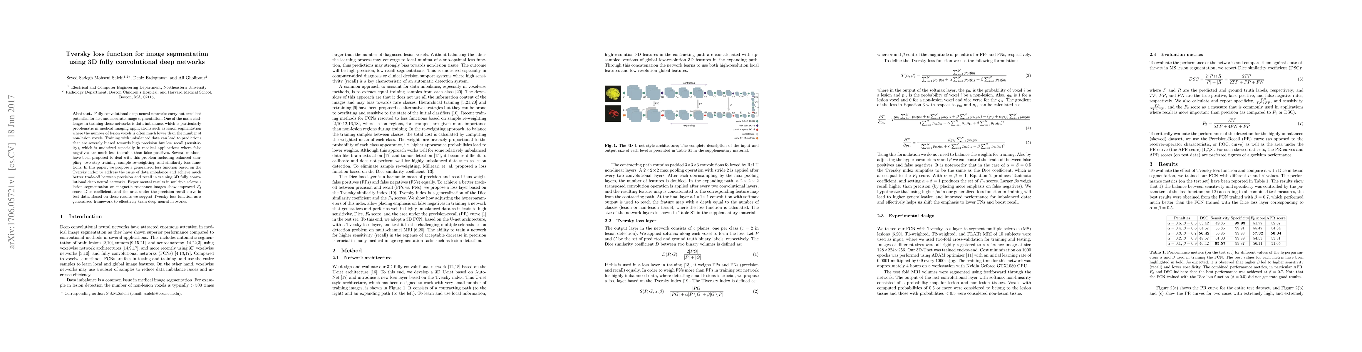 This paper proposes a Tversky loss function for training 3D fully convolutional deep neural networks to address data imbalance in medical image segmentation, achieving better precision-recall trade-offs. Experimental results on multiple sclerosis lesion segmentation show improved F2 score, Dice coefficient, and precision-recall curve, suggesting the Tversky loss function as an effective training method.