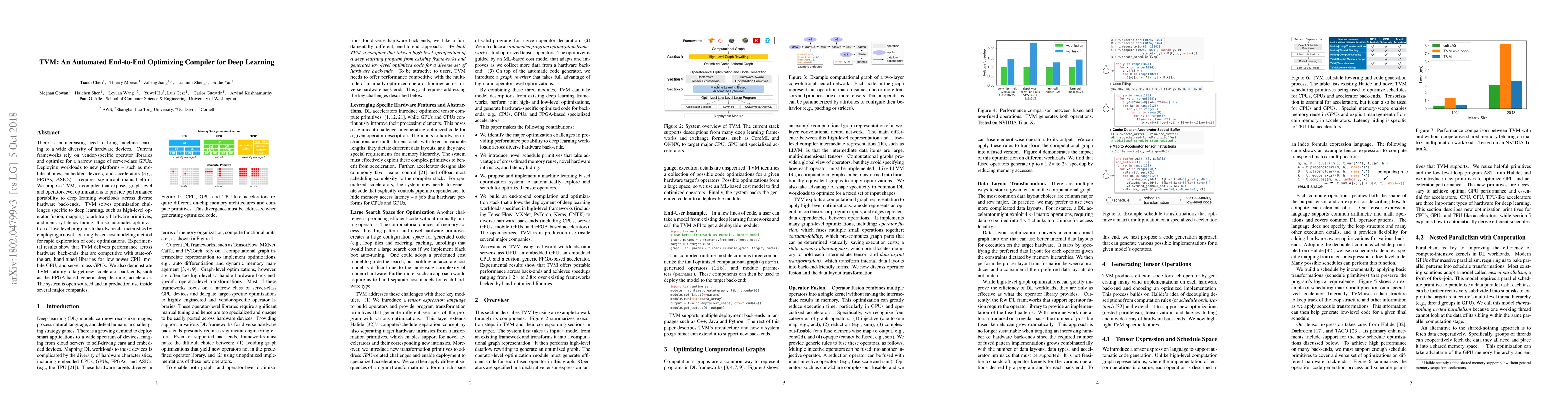 TVM is an automated optimizing compiler designed for deep learning workloads, enabling performance portability across diverse hardware platforms through graph-level and operator-level optimizations. It employs a learning-based cost modeling method for rapid optimization exploration, achieving competitive performance with hand-tuned libraries on various hardware devices.