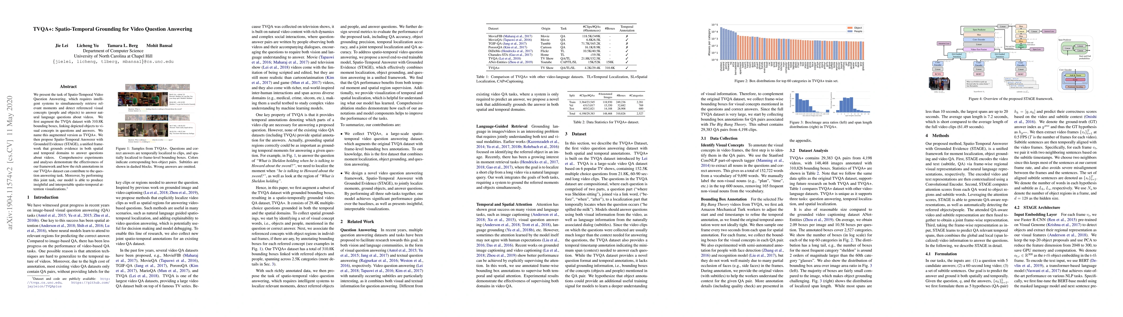 This paper introduces Spatio-Temporal Video Question Answering (TVQA+), enhancing the TVQA dataset with additional bounding boxes to link visual concepts in questions and answers. It proposes the STAGE framework to ground evidence in both spatial and temporal domains, showcasing its effectiveness through comprehensive experiments.