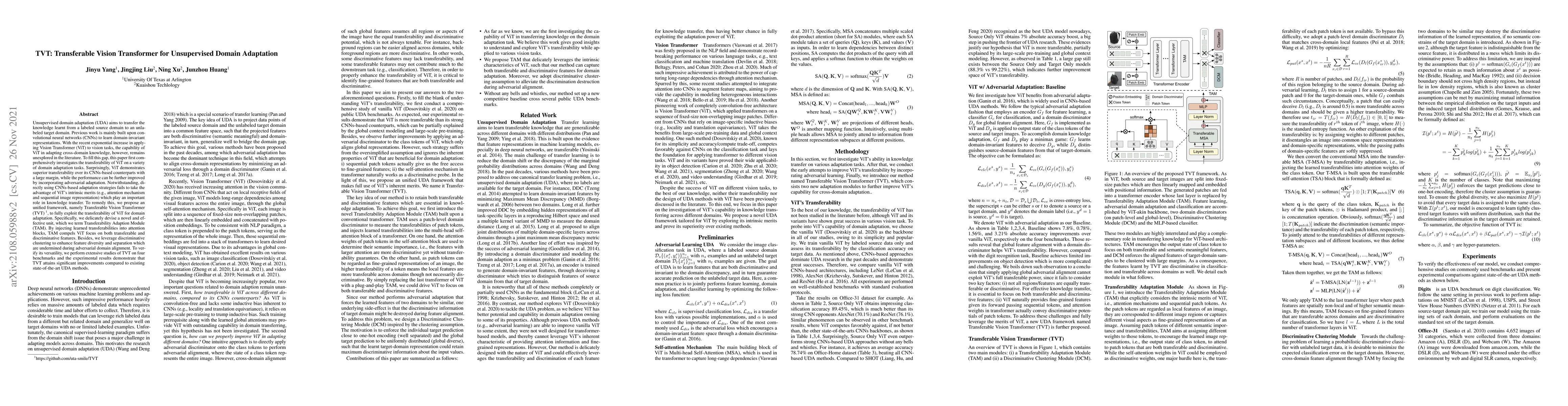 This paper investigates the transferability of Vision Transformers (ViT) for unsupervised domain adaptation (UDA), demonstrating ViT's superior performance over CNNs. To fully exploit ViT's potential, the authors propose a Transferable Vision Transformer (TVT) framework with a Transferability Adaption Module (TAM) that enhances focus on transferable and discriminative features, achieving significant improvements over existing UDA methods.