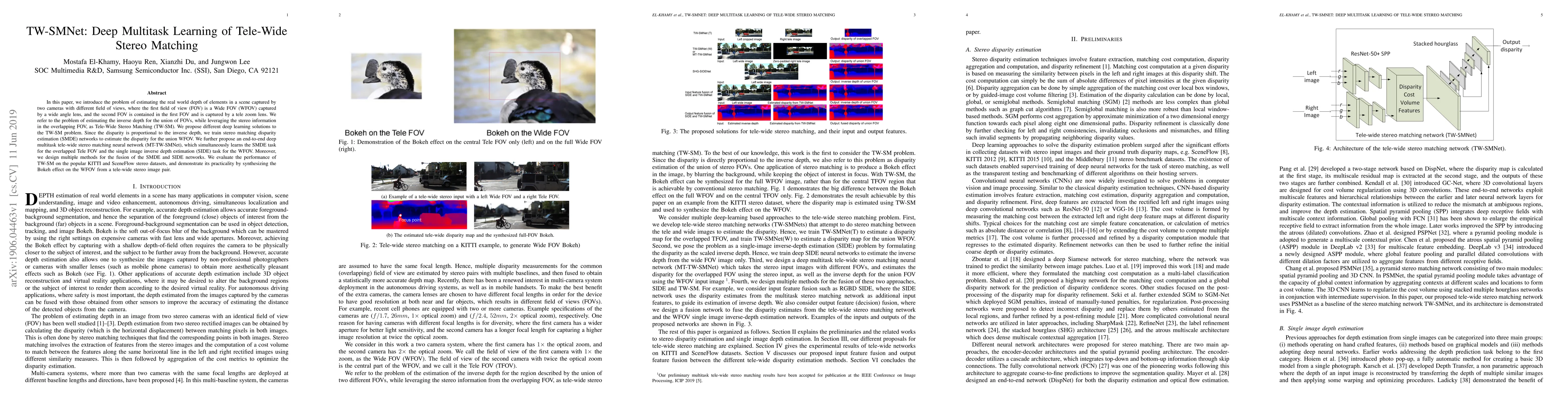 This paper introduces a deep multitask learning approach, MT-TW-SMNet, for estimating real-world depth in scenes captured by wide-angle and tele-zoom lenses. It proposes networks to simultaneously estimate disparity for overlapping fields and inverse depth for the wider field, demonstrating practical applications like synthesizing the Bokeh effect.