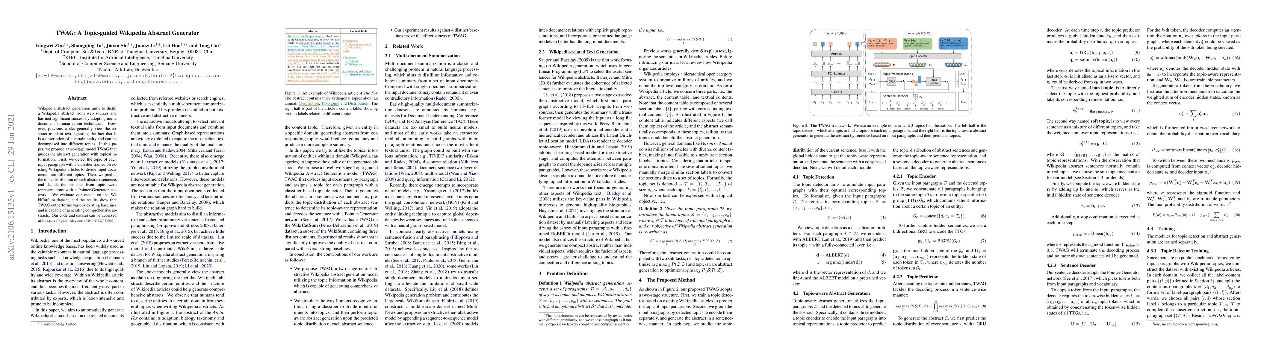 The paper proposes TWAG, a two-stage model for generating topic-guided Wikipedia abstracts using multi-document summarization techniques. It first classifies input paragraphs by topic and then generates sentences with topic distributions, outperforming existing baselines.