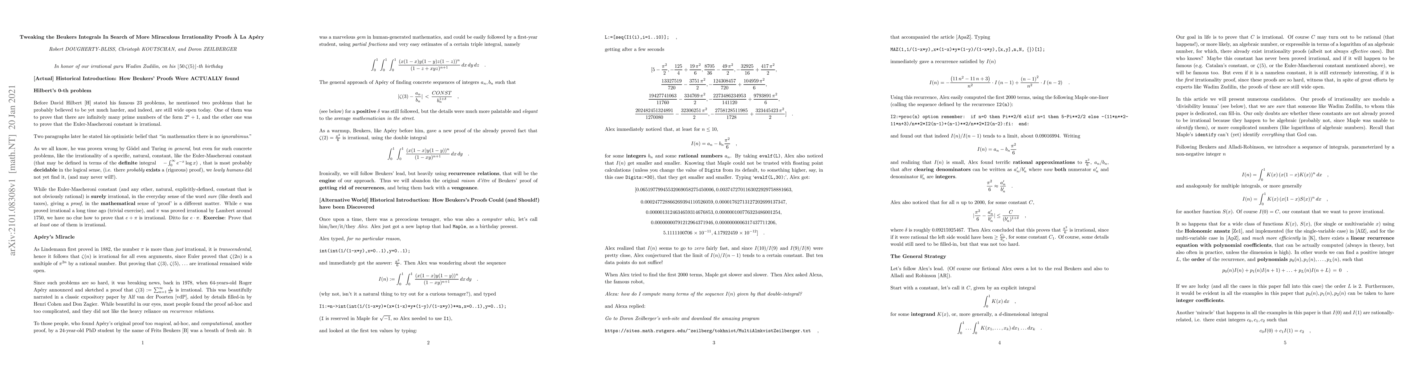 There are only aleph-zero rational numbers, while there are 2 to the power aleph-zero real numbers. Hence the probability that a randomly chosen real number would be rational is 0. Yet proving rigorously that any specific, natural, real constant, is irrational is usually very hard, witness that there are still no proofs of the irrationality of the Euler-Mascheroni constant, the Catalan constant, or Zeta(5). Inspired by Frits Beukers' elegant rendition of Apery's seminal proofs of the irrationality of Zeta(2) and Zeta(3), and heavily using algorithmic proof theory, we systematically searched for other similar integrals, that lead to irrationality proofs. We found quite a few candidates for such proofs, including the square-root of Pi times Gamma(7/3)/Gamma(-1/6) and Gamma(19/6)/Gamma(8/3) divided by the square-root of Pi.