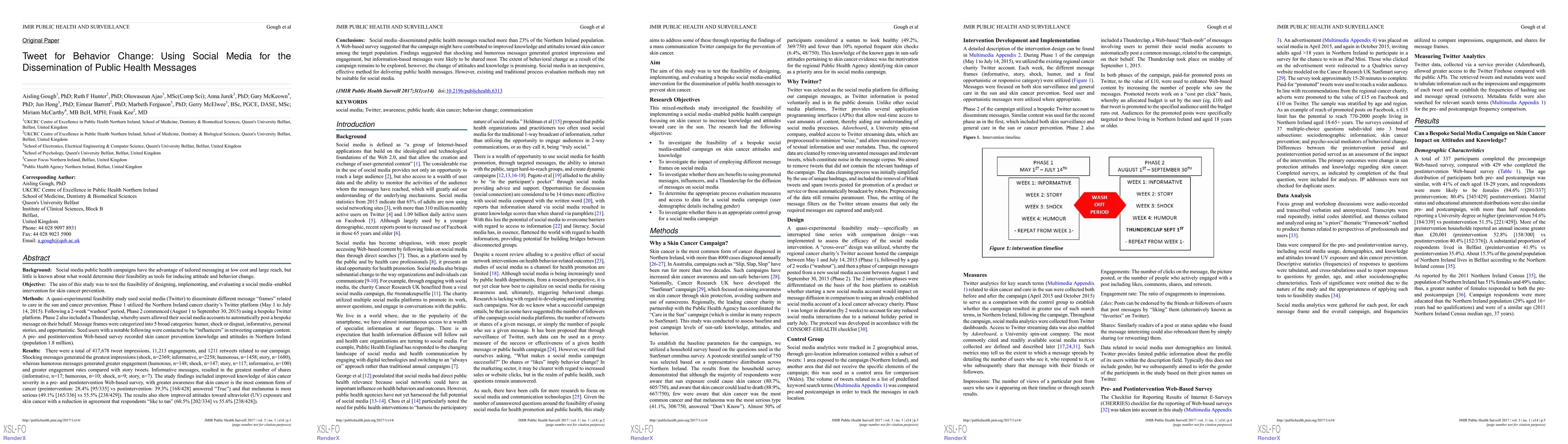 Background: Social media public health campaigns have the advantage of tailored messaging at low cost and large reach, but little is known about what would determine their feasibility as tools for inducing attitude and behavior change. Objective: The aim of this study was to test the feasibility of designing, implementing, and evaluating a social media-enabled intervention for skin cancer prevention. Conclusions: Social media-disseminated public health messages reached more than 23% of the Northern Ireland population. A Web-based survey suggested that the campaign might have contributed to improved knowledge and attitudes toward skin cancer among the target population. Findings suggested that shocking and humorous messages generated greatest impressions and engagement, but information-based messages were likely to be shared most. The extent of behavioral change as a result of the campaign remains to be explored, however, the change of attitudes and knowledge is promising. Social media is an inexpensive, effective method for delivering public health messages. However, existing and traditional process evaluation methods may not be suitable for social media.