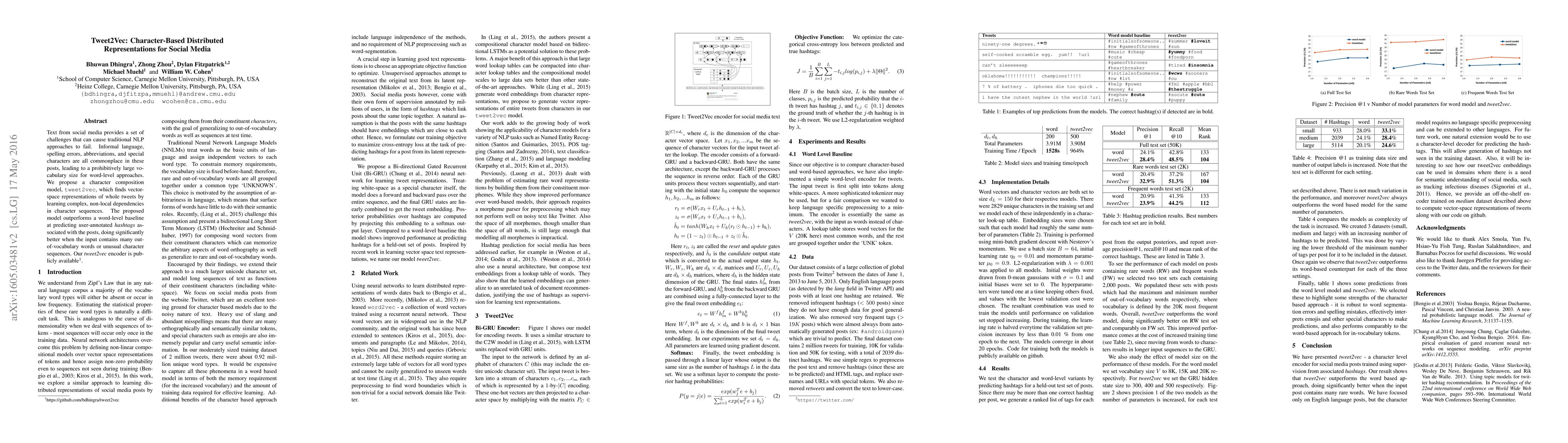 Tweet2Vec proposes a character-based model to represent social media text, addressing challenges from informal language and large vocabularies. It outperforms word-level methods in predicting hashtags, especially with out-of-vocabulary words and unusual sequences.