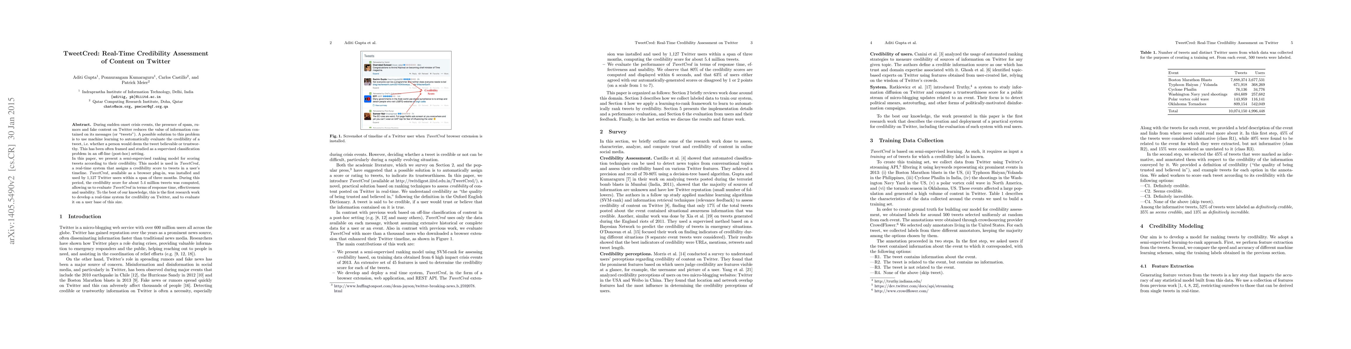 This paper introduces TweetCred, a semi-supervised ranking model for real-time credibility assessment of tweets on Twitter, addressing the issue of spam and misinformation during crisis events. The system, deployed as a browser plug-in, was used by 1,127 users to evaluate 5.4 million tweets, marking a significant effort in real-time credibility evaluation on Twitter.