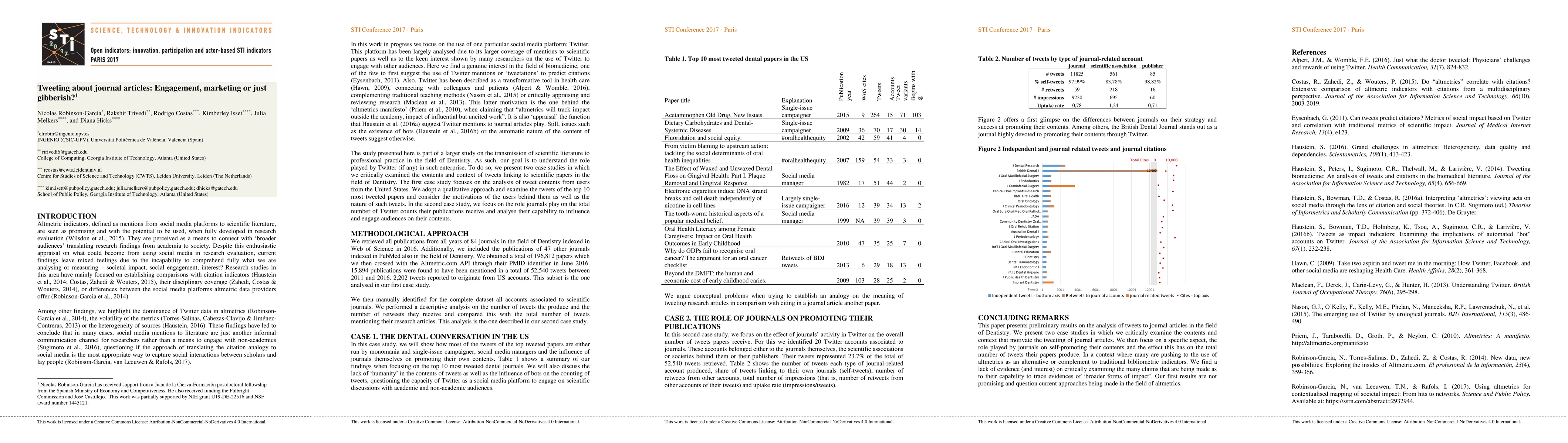 This paper presents preliminary results on the analysis of tweets to journal articles in the field of Dentistry. We present two case studies in which we critically examine the contents and context that motivate the tweeting of journal articles. We then focus on a specific aspect, the role played by journals on self-promoting their contents and the effect this has on the total number of tweets their papers produce. In a context where many are pushing to the use of altmetrics as an alternative or complement to traditional bibliometric indicators. We find a lack of evidence (and interest) on critically examining the many claims that are being made as to their capability to trace evidences of 'broader forms of impact'. Our first results are not promising and question current approaches being made in the field of altmetrics.